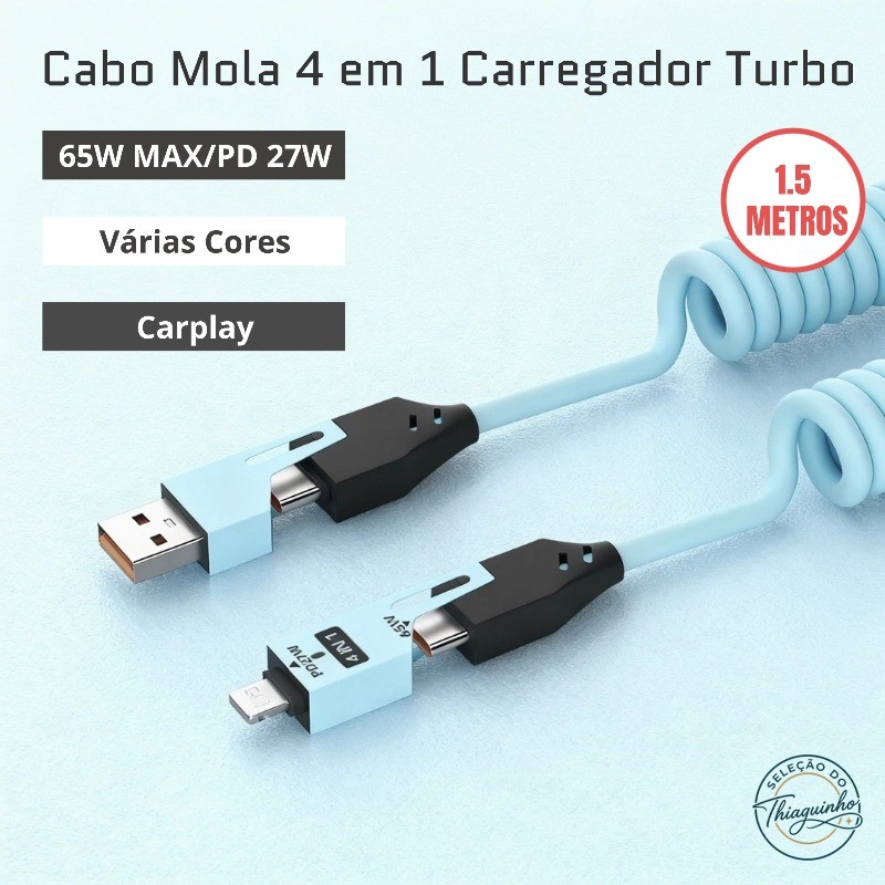 👇👇 CLIQUE EM "SEGUIR" E GANHE 👇👇 🎁 CUPOM DE R$ 2,00 AGORA! 🎁 .................................................. DESIGN 4 EM 1: A SOLUCAO DE CARREGAMENTO DEFINITIVA Este cabo carregador unico combina as quatro conexoes mais essenciais: USB-C para Lightning (iPhone), USB-C para USB-C, USB-A para Lightning e USB-A para USB-C. Nao ha mais necessidade de transportar multiplos cabos. ATENCAO: COMPATIBILIDADE VEICULAR << [ SIM ] Compativel com Apple CarPlay [ NAO ] NAO e compativel com Android Auto (Este cabo nao funciona para espelhamento de tela em carros com Android Auto, servindo apenas para carregamento nesses dispositivos). CARREGAMENTO RAPIDO 65W E DADOS Suporta carregamento rapido de ate 65W (para notebooks e celulares Android) e PD 27W (para iPhone). Alem disso, suporta transferencia de dados de alta velocidade de 480Mbps. DESIGN EM MOLA (ESPIRAL) FLEXIVEL Feito com conectores de liga de zinco de alta qualidade, este cabo possui um design em mola que se estica ate 1.5m e retrai automaticamente. E a solucao perfeita para manter o carro ou a mesa organizados, sem cabos emaranhados. NOTA SOBRE VELOCIDADE DE CARGA Para atingir a velocidade de carga rapida (Turbo/PD), lembre-se que e necessario usar uma fonte de alimentacao (tomada) que tambem seja compativel com essa tecnologia.