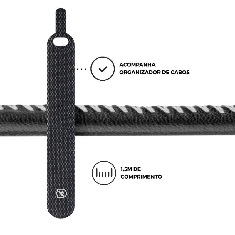 LEIA ANTES DE COMPRAR Atualmente, existem 3 tipos de entrada USB: a Micro UBS V8, a Tipo-C (ou Type-C) e a Lightning. É muito importante verificar qual a entrada do seu smartphone antes de comprar um cabo. Atente-se para a diferença entre os modelos! O Lightning é usado SOMENTE pela Apple, ou seja, todo iPhone possui entrada Lightning. O tipo Micro USB V8 é aquele mais tradicional, com um formato que lembra um trapézio (uma base maior e outra base menor). Já oTipo-C (ou Type-C) é simétrico, não possuindo lado diferentes - suas bordas são arredondadas. Qualquer dúvida utilize o campo de perguntas no final da página ou leia as avaliações de outros consumidores. O Cabo Turbo Militar, da Gorila Shield, é o dispositivo mais moderno do mercado. Desenvolvido com cabos trançados de Cobre Ionizado, o equipamento garante um carregamento extremamente rápido para seu aparelho. Por ser fabricado em couro reforçado de alta resistência e possuir costura a laser de nylon trançado de 2mm, o cabo da Gorila é um dos mais resistentes do mundo. ATENÇÃO: Na hora de usar e guardar o cabo deve-se tomar cuidado para NÃO DOBRAR as pontas do acessório. Ainda que ele seja reforçado, o ato de dobrá-lo com frequência danifica o interior do objeto! (não é compatível com MICRO USB / IPHONE) Se tiver dúvidas utilize o campo de perguntas no final da página ou leia as avaliações de outros consumidores. ESPECIFICAÇÕES Material: cabo trançado de cobre ionizado e revestido com nylon trançado Marca: Gshield Tamanho: 1,5m Cor: Preto Embalagem: 1 cabo Taxa de transmissão: 480Mbps Corrente: 3A Tensão: 5V Potência: 15W Carregamento: Qualcomm 3.0 3A COMPATIBILIDADE Compatível com aparelhos com entrada Type-C GARANTIA 3 meses contra defeitos de fabricação + Garantia Vitalícia Co-Participativa