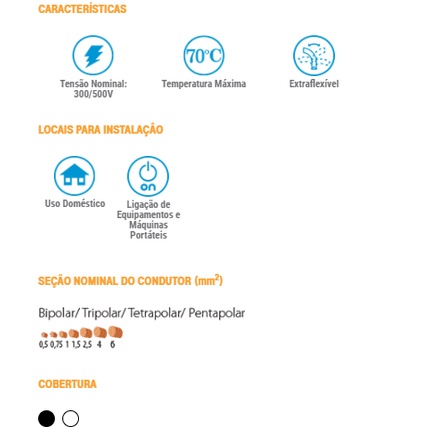 *** SOMOS A TT SHOP HOME - TRABALHAMOS APENAS COM PRODUTOS ORIGINAIS COM NOTA FISCAL*** ***SOLICITE VIA CHAT O SEU ORÇAMENTO EM MATERIAIS ELÉTRICOS, HIDRAÚLICOS COM DESCONTO ESPECIAL*** - Cabo cortado com a medida escolhida (Vendemos de todos os tamanhos, solicitar metragem desejada via chat ) Cabo PP 2X1,5 Silflex Bipolar - Sil Fios 500V Preto APLICAÇÃO: O Cabo Silflex PP 500V possui grande flexibilidade e excelente resistência a sua movimentação. Ideal para ligações de aparelhos elétricos em geral, móveis ou fixos, como eletrodomésticos, ferramentas motorizadas e extensões. CONDUTOR: Fios de Cobre, têmpera mole, classe 5 atendendo a norma ABNT NM 280. ISOLAÇÃO: Composto termoplástico polivinílico tipo PVC/D. COBERTURA: Composto termoplástico polivinílico tipo PVC/ST5. NORMA DE REFERÊNCIA: NBR NM 247-5 - Cabos isolados com policloreto de vinila (PVC) para tensões nominais até 450/750 V, inclusive Parte 5: Cabos flexíveis (cordões) (IEC 60227-5, MOD). NORMAS APLICÁVEIS: NBR NM 280 e NBR NM 247-2. DESIGNAÇÃO DO PRODUTO: 247 NM 53-C