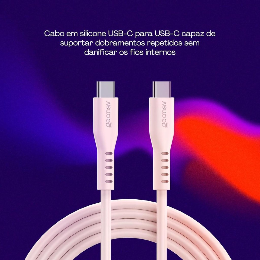 • O Toque Suave do Silicone com a Potência do Carregamento Rápido: O Cabo USB-C em Silicone da Geonav combina um design moderno e um toque super macio com a performance do carregamento rápido. O cabo que você não vai querer largar! • Revestimento em Silicone: O acabamento em silicone líquido é extremamente flexível, não embaraça e proporciona um toque suave e agradável. • Carregamento Rápido de até 60W: Suporta o padrão Power Delivery de até 60W, perfeito para carregar smartphones, tablets e notebooks compatíveis em alta velocidade. • Design Moderno na Cor Rosa: Dê um toque de cor e estilo aos seus acessórios. Comprimento de 1,5 metros para mais conveniência. • Palavras-chave: Cabo USB-C, Geonav, Silicone, Rosa, Carregamento Rápido, 60W, Power Delivery, Toque Suave.