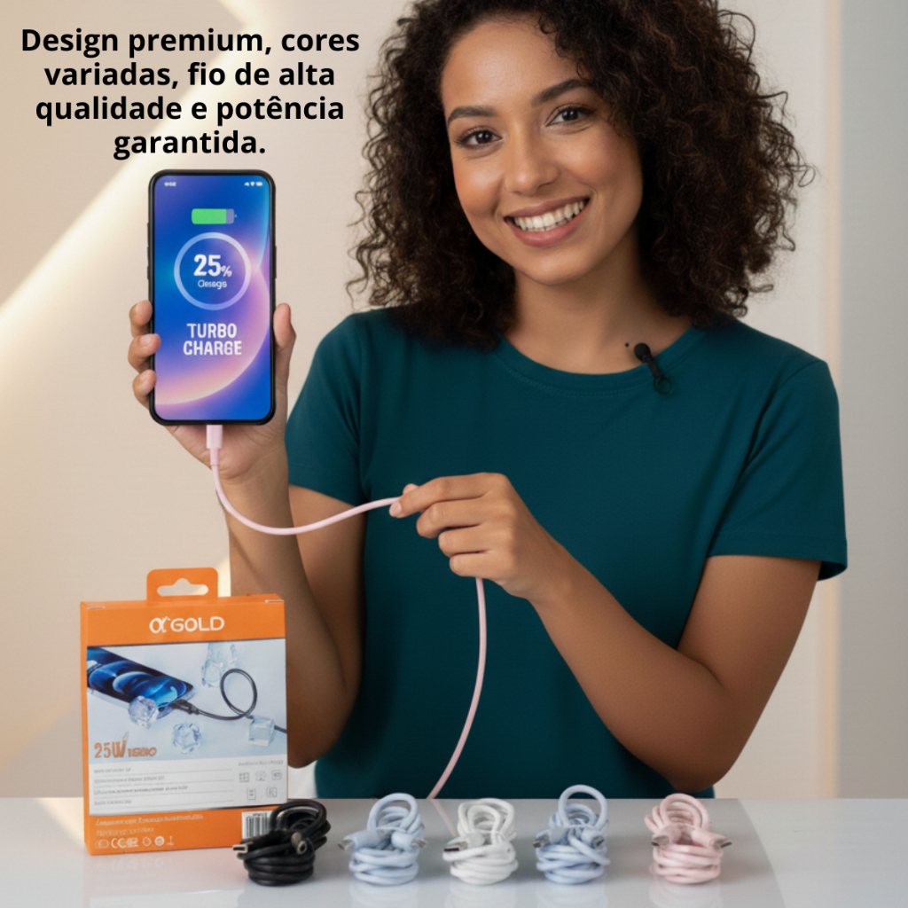 Cabo Tipo-C α’GOLD 25W Turbo – Potência, Estilo e Desempenho em Cada Conexão Cansado de esperar horas para o celular carregar? Com o α’GOLD 25W Turbo, você sente a diferença desde a primeira carga. Desenvolvido com tecnologia inteligente e materiais de alta qualidade, este cabo oferece velocidade real de carregamento, segurança reforçada e um design moderno que combina elegância e praticidade. Por que o α’GOLD é diferente -Carregamento Turbo de 25W para máxima eficiência -Conector Tipo-C universal, compatível com Samsung, Motorola, Xiaomi, Realme, Asus e outros -Transmissão de dados ultrarrápida e estável -Chip inteligente integrado que protege contra aquecimento e sobrecarga -Cabo reforçado e durável, feito para uso intenso -Design premium com acabamento sofisticado Mais potência. Mais estilo. Mais você. Com 1 metro de comprimento, o Cabo α’GOLD é ideal para uso em casa, no trabalho ou no carro. Proporciona um carregamento rápido, seguro e com desempenho superior. É o cabo premium que une força, durabilidade e beleza, para quem exige mais do dia a dia. -Destaques do produto -Potência real de 25W Turbo -Cabo tipo-C reforçado e flexível -Chip inteligente com proteção múltipla -Design elegante e moderno -Transmissão de dados + carregamento rápido Disponível nas cores Preto, Branco, Rosa e Azul (enviamos conforme estoque) Compatível com diversas marcas e modelos (SAMSUNG, XIAOMI, MOTOROLA ETC..) α’GOLD — Potência com elegância. Carregamento inteligente que acompanha o seu ritmo.