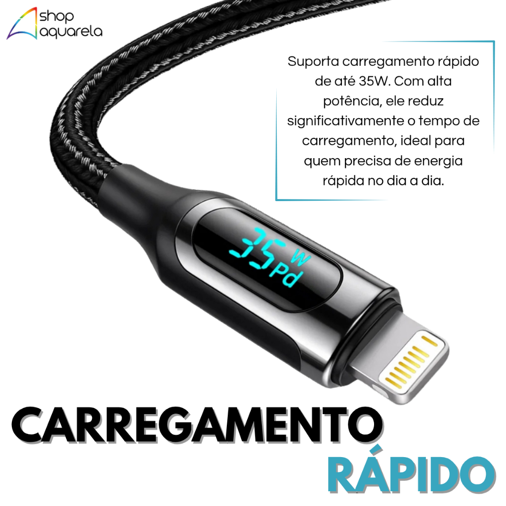 Cabo Carregador 35W Tipo-C para Lightning com Display Digital – Premium Eletromex Transforme sua rotina com o Cabo de Dados 35W da linha Premium Eletromex. Fabricado com materiais de alta qualidade, este cabo alia tecnologia, desempenho e durabilidade. Ideal para quem busca carregamento rápido e transferência de dados eficiente, com compatibilidade total entre portas Tipo-C e Lightning. O que acompanha o produto: • 1x Cabo Eletromex Tipo-C para Lightning com Display Digital – 35W Destaques: • Carregamento rápido de até 35W • Tela digital integrada com status em tempo real • Alta compatibilidade com dispositivos Lightning e USB-C • Design moderno, compacto e elegante • Durabilidade premium com reforço anti-quebra • Ideal para uso diário intenso Especificações Técnicas: • Marca: Eletromex • Linha: Premium • Conectores: USB-C (entrada) / Lightning (saída) • Potência: 35W • Display: Tela digital indicadora de carregamento • Funções: Carregamento rápido e transferência de dados • Material: Reforçado, resistente ao uso contínuo Dúvidas Frequentes: • Funciona com iPhone? Sim, é compatível com todos os modelos com entrada Lightning. • É compatível com carregadores turbo? Sim, especialmente com fontes que suportam até 35W via USB-C. • O visor mostra a potência em tempo real? Sim, o display digital exibe o status da carga enquanto o cabo está em uso. • Serve para transferir dados? Sim, além de carregar, permite sincronização rápida e estável de arquivos. Adquira já o seu Cabo Premium Eletromex e descubra um novo nível de praticidade e desempenho.