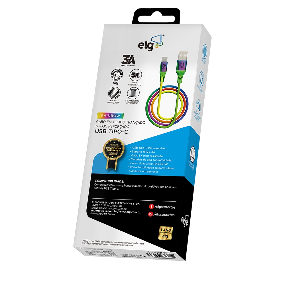 Velocidade, segurança e durabilidade: sua recarga com potência máxima. O Cabo USB Tipo-C ELG TC10RB Rainbow é a escolha perfeita para quem busca estilo, irreverência e alto desempenho no dia a dia. Com cores vibrantes no estilo Rainbow e conectores metálicos multicoloridos, é um acessório com muita personalidade que vai destacar o seu setup onde quer que você esteja. Fabricado com cabo de nylon trançado reforçado, oferece até 5 vezes mais resistência, evitando desgastes e emaranhados. Além disso, seu cabeamento interno em cobre de alta condutividade garante melhor transferência de energia, carregamento rápido e menor aquecimento. Compatível com tecnologia de carga rápida (Quick Charge) até 3A/15W, o TC10RB proporciona sincronização de dados estável e recargas seguras e eficientes. Com 1 metro de comprimento, é ideal para uso em casa, no trabalho ou em viagens. Características Técnicas: Compatibilidade: smartphones e dispositivos com conector USB Tipo-C Comprimento: 1 metro Conector: USB Tipo-C metálico blindado Cor: Rainbow (multicolorido) Corrente: 3A Potência: 15W Fabricação: conector metálico em alumínio multicolorido e cabo em nylon trançado reforçado Extras: cores vivas estilo Rainbow, USB Tipo-C 2.0 reversível, até 5x mais resistente, materiais de alta condutividade, conector blindado soldado a laser, alta performance IMPORTANTE :: As imagens dos produtos são meramente ilustrativas e podem apresentar pequenas variações de cor ou acabamento, conforme iluminação, resolução do monitor ou percepção visual. :: Objetos de decoração e itens adicionais exibidos nas fotos não acompanham o produto. :: Todas as informações técnicas e características dos produtos são de responsabilidade da marca ELG, podendo sofrer alterações sem aviso prévio. :: Os pedidos são sempre enviados de forma completa. Caso haja produtos com prazos de postagem diferentes, será considerado o maior prazo para envio do pedido. :: Valores e condições podem ser alterados sem aviso prévio e são válidos exclusivamente para compras realizadas neste site. :: A garantia ELG é limitada ao produto e não cobre danos ocasionados por mau uso, instalação incorreta ou manuseio inadequado. SOBRE A ELG: A ELG é uma empresa brasileira que preza pela alta qualidade. Nossa política é aplicada em toda linha de produtos e garante que os consumidores possam adquirir itens que foram amplamente testados.