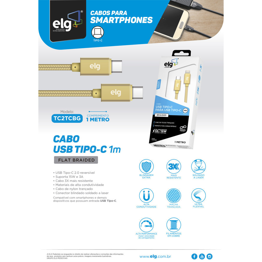 Velocidade, segurança e durabilidade: sua recarga com potência máxima. O Cabo USB Tipo-C para Tipo-C ELG TC2TCBG foi desenvolvido para oferecer praticidade, resistência e alto desempenho em todas as conexões. Com design reversível, permite encaixar em qualquer posição, facilitando o uso em dispositivos compatíveis. Compatível com smartphones, tablets, notebooks, MacBook, Chromebook Pixel e demais dispositivos com entrada USB Tipo-C, o TC2TCBG suporta carga rápida de até 15W (3A/5V) e transferência de dados em alta velocidade de até 480Mbps, garantindo eficiência e segurança em recargas e sincronizações. Fabricado com cabo de nylon trançado reforçado, oferece até 3 vezes mais resistência contra desgastes e dobras, sem abrir mão da flexibilidade. Seus conectores metálicos blindados soldados a laser proporcionam maior durabilidade e proteção. Com 1 metro de comprimento, é ideal para uso no dia a dia em casa, no trabalho ou em viagens. Características Técnicas: Compatibilidade: smartphones, tablets e notebooks com conector USB Tipo-C Comprimento: 1 metro Conector: USB Tipo-C 2.0 (reversível em ambas as extremidades) Cor: Dourado Corrente: 3A Potência: 15W Fabricação: conector metálico / cabo em nylon trançado reforçado Extras: design reversível, cabo 3x mais resistente, alta performance, materiais de alta condutividade, transferência de dados até 480Mbps IMPORTANTE :: As imagens dos produtos são meramente ilustrativas e podem apresentar pequenas variações de cor ou acabamento, conforme iluminação, resolução do monitor ou percepção visual. :: Objetos de decoração e itens adicionais exibidos nas fotos não acompanham o produto. :: Todas as informações técnicas e características dos produtos são de responsabilidade da marca ELG, podendo sofrer alterações sem aviso prévio. :: Os pedidos são sempre enviados de forma completa. Caso haja produtos com prazos de postagem diferentes, será considerado o maior prazo para envio do pedido. :: Valores e condições podem ser alterados sem aviso prévio e são válidos exclusivamente para compras realizadas neste site. :: A garantia ELG é limitada ao produto e não cobre danos ocasionados por mau uso, instalação incorreta ou manuseio inadequado. SOBRE A ELG: A ELG é uma empresa brasileira que preza pela alta qualidade. Nossa política é aplicada em toda linha de produtos e garante que os consumidores possam adquirir itens que foram amplamente testados.
