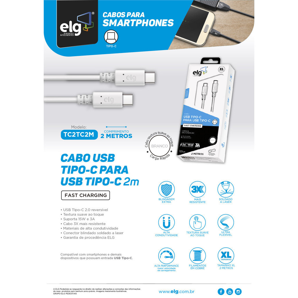 Cabo USB Tipo-C para USB Tipo-C, Carga Rápida 15W 3A, 2 metros, Branco, TC2TC2M, ELG