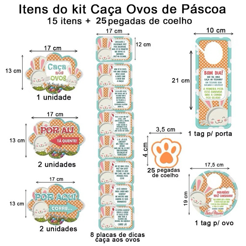 O Caça aos Ovos de Páscoa pode ser uma ótima ideia para tornar a celebração ainda mais divertida, especialmente para as crianças, criando memórias afetivas junto com seus familiares. Capriche na criatividade! Descrição do Produto: O Caça contém 15 itens + 25 pegadas de coelho 8 Placas de dicas a caça aos ovos 1 Placa ´´Caça aos Ovos`` 2 Placas ´´Por Aqui`` (Com setas) 2 Placas ´´Por Lá`` (Com setas) 1 Tag de Porta (Bom dia) 1 Tag para Ovo de Páscoa (Você Achou!) 25 Pegadas de coelho * Impressão em alta qualidade * Recorte Digital * Impresso em Papel Fotográfico Glossy - 230g (NÃO É ADESIVO) * O kit vai embalado em saco transparente Os itens vão acompanhados de fita dupla face para facilitar a retirada após o uso (Evitando deixar resíduos de cola de adesivo e danificar os lugares que foram colados) As medidas de todos os itens estão especificadas nas fotos do anúncio. OBSERVAÇÃO: Temos variações com 1, e ou 3 unidades, pedimos atenção ao realizar a compra da quantidade correta Em caso de dúvidas, enviar msg para o nosso chat que tiramos todas suas dúvidas.