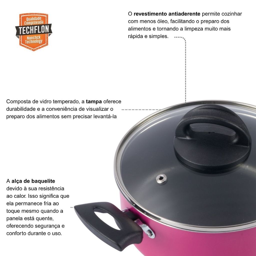 Panela caçarola Antiaderente Avulsa Techflon Linha Color N20 2,5 litros Você vai se impressionar com a beleza e a funcionalidade da nossa Linha Color. Produzido em alumínio com revestimento interno e externo em antiaderente Techflon, ele proporciona um cozimento rápido e uniforme dos alimentos e evita que os mesmos grudem em sua superfície, facilitando a limpeza. Informações Adicionais: - Corpo Alumínio com revestimento antiaderente Techflon interno e externo com 5 camadas. - Os alimentos não grudam. - Fácil de limpar. - Cabo de baquelite antitérmico, proporcionando maior segurança no manuseio. Dimensões aproximadas Altura: 9cm Diâmetro: 20cm Capacidade: 2,5 Litros