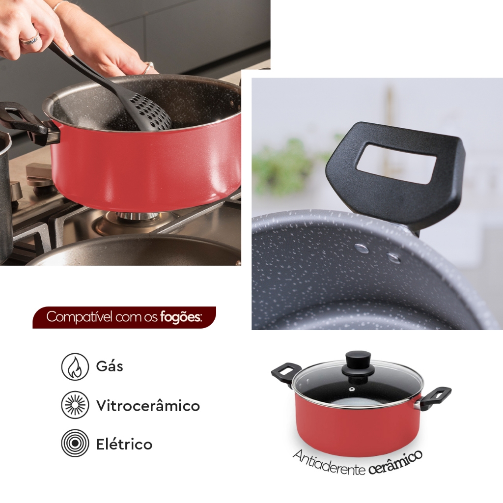 Seja Bem-Vindo(a) à Mimorada! Caçarola com Tampa Brinox Ceramic Life Naturalle Ø22 cm – 3,4 L – Vermelho Garlic A Caçarola Ø22 cm da linha Naturalle é ideal para o preparo de receitas que exigem maior volume, como ensopados, massas, arroz e refeições completas. Com capacidade de 3,4 L e altura de 10 cm, é perfeita para quem valoriza desempenho, praticidade e estilo na cozinha. Fabricada com estrutura em alumínio de 1,2 mm de espessura, proporciona aquecimento rápido e uniforme, otimizando o tempo de preparo dos alimentos. O revestimento interno cerâmico Pro Ceramic é resistente, livre de PFOA e permite o uso de menos óleo, garantindo preparos mais saudáveis e uma limpeza muito mais fácil. As alças laterais em baquelite antitérmico proporcionam segurança e conforto durante o manuseio. A tampa de vidro temperado com saída para vapor permite acompanhar o cozimento sem precisar abrir a panela. O acabamento externo na cor Vermelho Garlic adiciona um toque moderno e vibrante, enquanto o interior grafite com pintinhas reforça o design elegante da linha. Especificações Técnicas: • Diâmetro: Ø22 cm • Altura: 10 cm • Capacidade: 3,4 L • Espessura: 1,2 mm • Estrutura: Alumínio • Revestimento interno: Cerâmico Pro Ceramic (livre de PFOA) • Alças: Baquelite antitérmico • Tampa: Vidro temperado com saída para vapor • Cor externa: Vermelho Garlic • Cor interna: Grafite com pintinhas Compatível com fogões: • Fogão a gás • Fogão elétrico • Fogão vitrocerâmico • Não compatível com fogão de indução Compromisso com a sustentabilidade: No Grupo Brinox, a sustentabilidade é um compromisso contínuo. Adotamos práticas que minimizam o impacto ambiental, como a utilização de matérias-primas recicláveis e processos produtivos eficientes. Investimos em tecnologias limpas e buscamos constantemente a redução de resíduos e consumo de energia. Nosso objetivo é promover um futuro mais verde, integrando a responsabilidade ambiental em todas as etapas do nosso negócio.