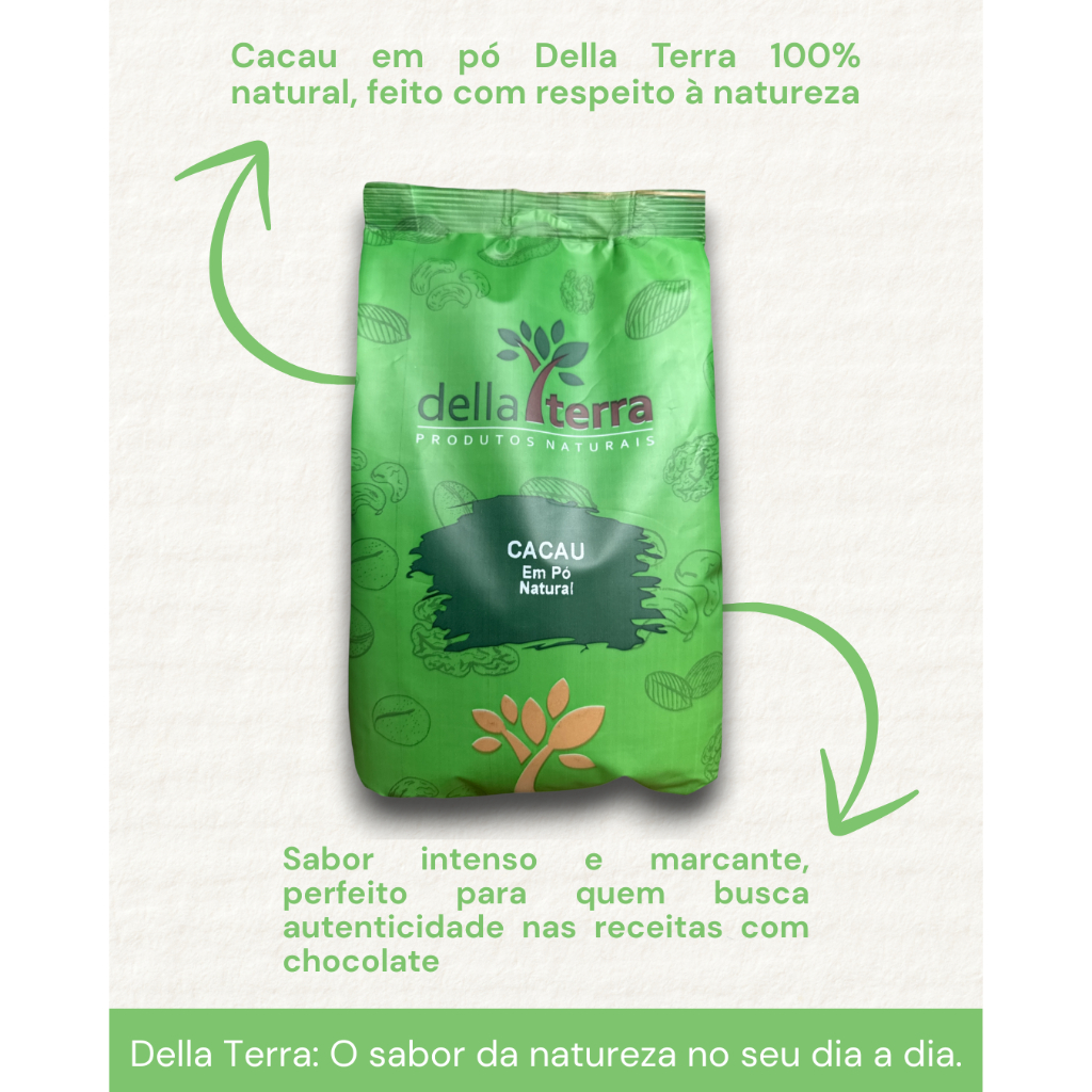 *Obs: Imagem do rótulo meramente ilustrativo. O cacau em pó natural Della Terra, é conhecido pelo seu sabor rico e intenso de chocolate, com notas de amargor. Produzido a partir dos grãos de cacau, que são torrados e moídos em pó. Seus nutrientes proporcionam diversos benefícios a saúde, como: Rico em flavonoides, que são antioxidantes, e os mesmos, protegem nossas células de radicais livres; Também, rico em fibras, que trazem muitos benefícios, como, promover saciedade, auxiliar no controle da glicemia, atuar no controle do colesterol e manter o bom funcionamento do intestino. Por fim, excelente fonte de energia, ferro e magnésio. Seu PH é ácido, entre 5 e 6, sendo assim, pode misturar com bicarbonato de sódio. Muito apreciado pelo seu sabor robusto, pode ser adicionado em diversas receitas, substituindo o achocolatado comum. A melhor maneira de armazenamento é manter em potes fechados, de preferência herméticos. INGREDIENTES: CACAU EM PÓ. NÃO CONTÉM GLÚTEN.