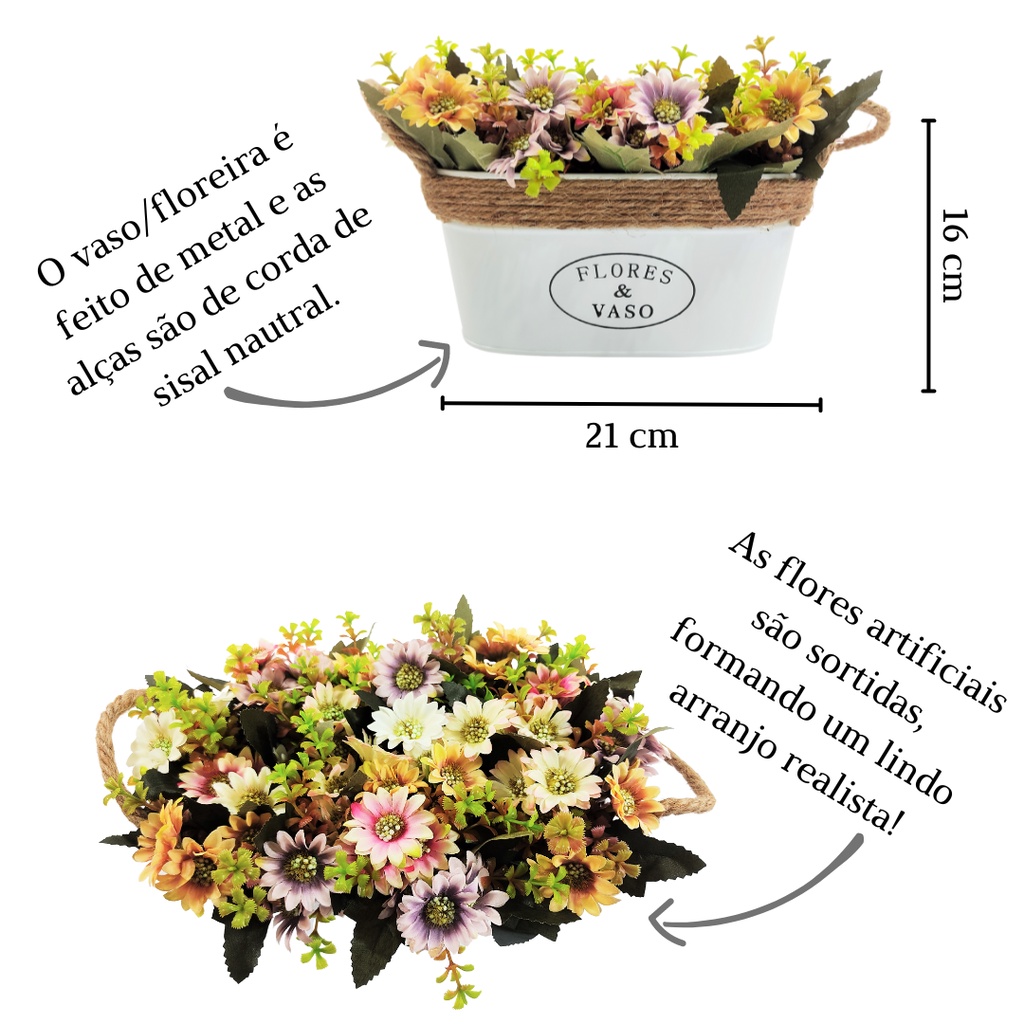 Cachepo Arranjo Flores & Vaso Floreira Metal E Alça De Corda