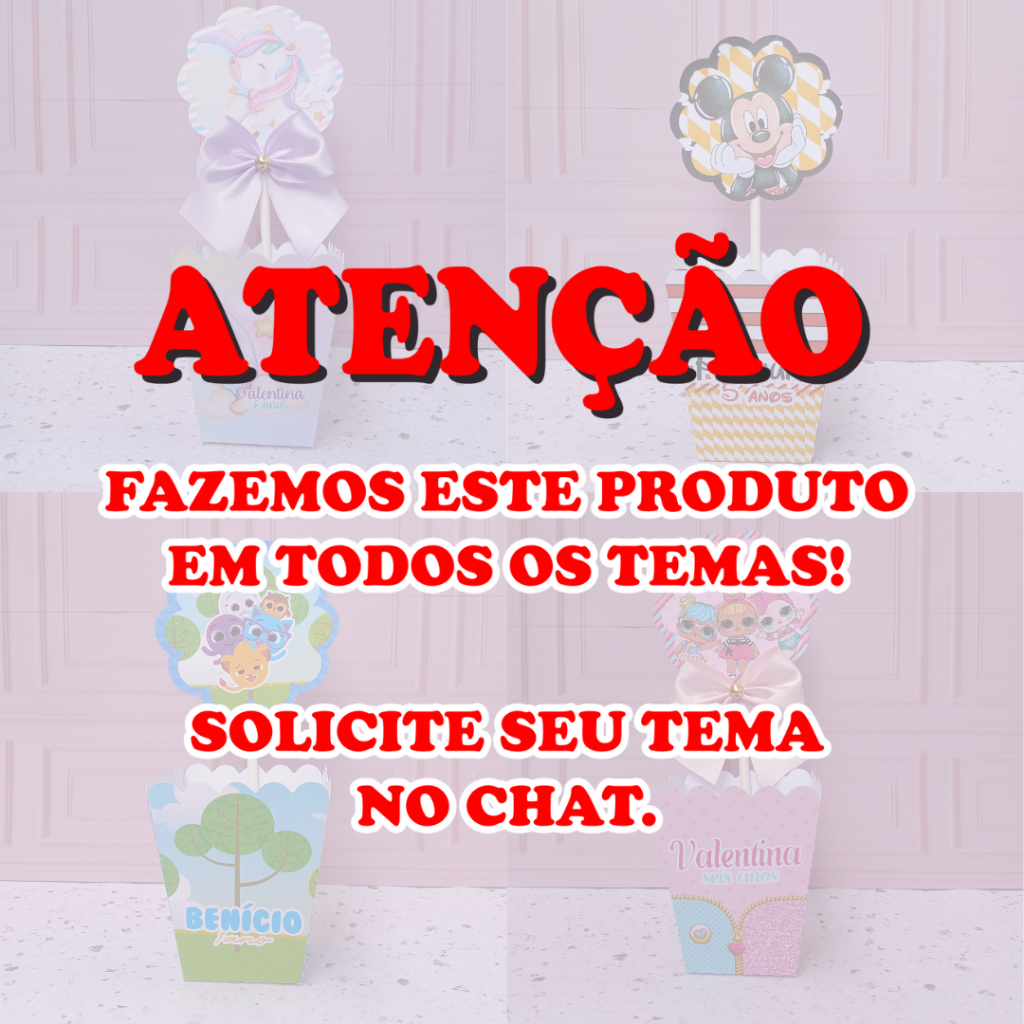 ***ATENÇÃO*** PEGUE E MONTE CENTRO DE MESA SE DESEJA LAÇOS E SÓ ESCOLHER NA NA OPÇÃO COM OU SEM LAÇOS. • PEGUE E MONTE: Personalizados para você montar em casa, recortados e com vinco. Você vai precisar colar apenas na lateral,o fundo são de encaixe. TIPO DE COLA : COLA QUENTE, COLA SILICONE,COLA PANO, COLA CASCOREZ - COLA MADEIRA. **PRAZO DE ENTREGA** Faça uma simulação adicionando o produto no carrinho e informando seu cep, a shopee vai calcular automaticamente o prazo de chegada. (esse prazo já é considerando nosso tempo de produção) **IMPORTANTE** Não nos responsabilizamos pelo prazo de entrega, por isso sugerimos comprar com antecedencia. **ATENÇÃO** ENVIAR OS NOMES PELO CHAT NO PRAZO DE 24H, CASO CONTRÁRIO, ENVIAREMOS SEM PERSONALIZAÇÃO. Nosso centro de mesa é impresso em papel fosco 240g - qualidade alta Canudo na cor branca e o tom do laço pode ter alteração, mas sempre combinando com o tema. Medidas aproximadas: Parte superior do cachepot: 9cm Parte inferior (fundo): 6,5cm Altura do cachepot: 9,5cm Medida total considerando cachepot e canudo: 22cm Caso não encontre o tema desejado nos chame no chat que personalizamos pra você. Estou a disposição através do chat para te ajudar ♥