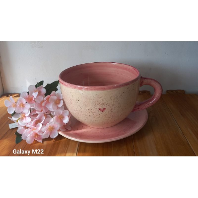 xicara de porcelana decorativa ideal para incrementar ambientes como: sala,cozinha,jardim,festas exemplo chá de mulheres e arranjos florais. Não deixe de adquirir essa linda peça pois de sofisticada também é versátil e acrescenta um chame todo especial em composição como cantinho do café, porta bombons ou na mesa posta para servir sopa. Medida Xicara - 21cm de diâmetro e 27cm de comprimento ate a alça, 14cm de altura. Pires - 26cm de diâmetro.