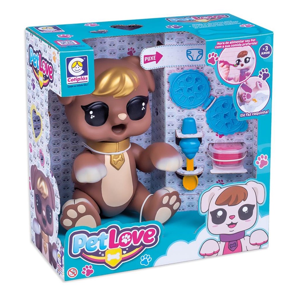 CACHORRINHO PET LOVE - COTIPLAS A nova colecao Pet Love da Cotiplas tras lindos cachorrinhos para colecionar! Molde os alimentos para o seu Pet e use sua criatividade com este divertido conjunto de acessorios com massinha! Depois de comer sua comidinha preferida o Pet faz caquinha na fraldinha. E super divertido! Feito em vinil macio e perfumado, com o alto padrao de qualidade caracteristico dos produtos Cotiplas. Estimula a interacao entre pais e filhos, coordenacao motora, criatividade e imaginacao da crianca. =) ESPECIFICACOES: - Recomendado para criancas a partir de 3 anos - Dimensoes da embalagem (CLA): 32,5 x 16 x 33,5 cm - Altura aproximada do boneco: 29 cm - Contem: 01 Boneco, 01 Fraldinha, 01 Colherzinha, 01 Massinha, 01 Molde para Massinha - Modelo: Pet Love - Marca: Cotiplas - Referencia: 2415 - Certificado de Seguranca: INMETRO.