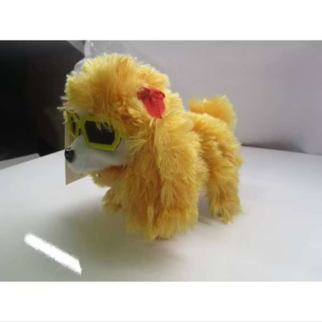 O produto ilustrado é um cachorro de pelúcia. Este cachorro de pelúcia possui as seguintes características: Aparência: O cachorro de pelúcia é coberto por pelúcia e usa óculos de sol e uma faixa na cabeça. Informações de fabricação: De acordo com o texto na embalagem, este produto é fabricado na China. Funções: Este tipo de brinquedo geralmente é elétrico, capaz de andar e latir.