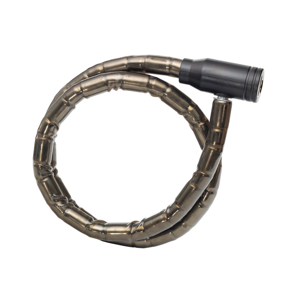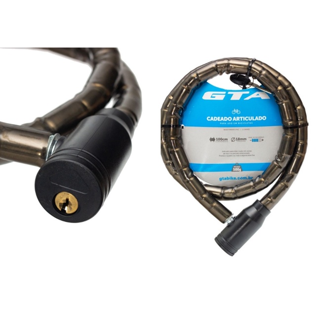 CADEADO ARTICULADO PARA BICICLETAS Marca: GTA Cor: Fume Comprimento: 1000mm (1 metro) Espessura: 18mm Composição: Aço Revestimento: PVC Peso aproximado: 400g Acompanha duas chaves NÃO ACOMPANHA SUPORTE