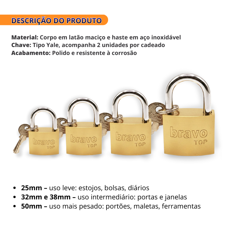 Cadeado Bravo 25mm a 50mm – Corpo Reforçado com Chave | Segurança Doméstica e Comercial