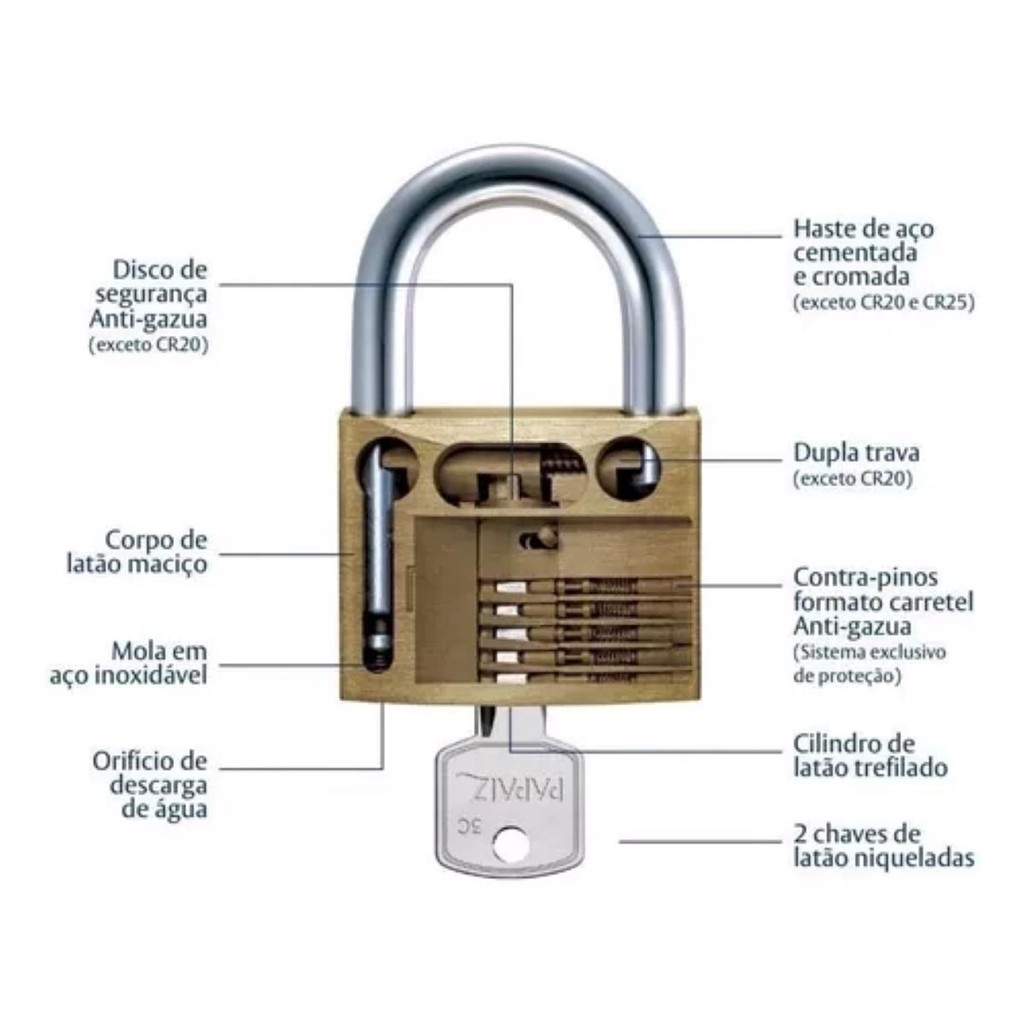 Cadeado em Latão de CR30 Linha Clássica Fabricados com matérias-primas de alta qualidade, sistemas de segurança exclusivos e tecnologia sempre atualizada, os cadeados da Linha Clássica são sinônimos de proteção e referência mundial de qualidade. Com a Linha Standard, todos se sentem mais seguros. São cadeados de padrão exportação que proporcionam muita qualidade para as mais diversas aplicações. Informações Técnicas Produzido em latão maciço haste de aço cementada e cromada. 2 chaves de latão niqueladas. » Medidas: Largura do Corpo: 30 mm Altura do Corpo: 27,5mm Espressura do Corpo: 13,7mm Altura da Haste: 20,5mm Espessura da Haste: 5mm Utilização Acesso ao Registro de Luz e Caixa de Correio Portões e Janelas Cadeado Em Latão De Cr30 Linha Clássica Papaiz Cor Dourado