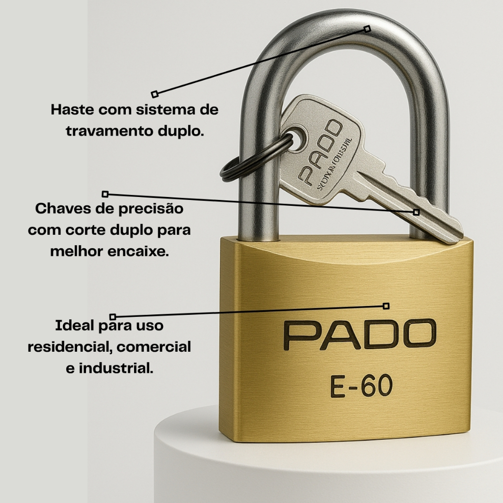 TODOS OS PRODUTOS SÃO NOVOS E ACOMPANHAM NOTA FISCAL. Qualquer dúvida entre em contato conosco, será um prazer atendê-lo! ---------------------------------------------------------------------- Cadeado Pado Latão Medidas disponíveis: 40mm, 45mm, 50mm, 60mm Líder no mercado nacional, a Pado é sinônimo de cadeado em latão. Além da linha tradicional, possui uma variedade de modelos para as mais diversas aplicações. Dimensões e medidas: na hora da compra é importante ter claro a informação de qual é a finalidade do cadeado e por isso existem as medidas que são desenvolvidas para determinar a garantia de proteção da área ou objeto escolhido. Exemplo: em um nível mais leve, opte pelas medidas 20 A 25mm para proteção de bolsas, armários pequenos, maletas e derivados; Em níveis medianos de risco, opte pelas medidas 30 a 40mm para a proteção de janelas residenciais; Em níveis altos de cobertura, opte pelas medidas 40 a 60mm, indicadas para portões residenciais, caminhões, lojas e áreas maiores. Fabricação Nacional - (valorize o produto interno) - Corpo robusto de latão maciço - Haste em aço cromada e temperada - Trava Simples de Segurança - Disco anti-Gazua - Cilindro em latão trefilado - Molas em aço inoxidável - 2 chaves de latão niqueladas - 5 anos de garantia