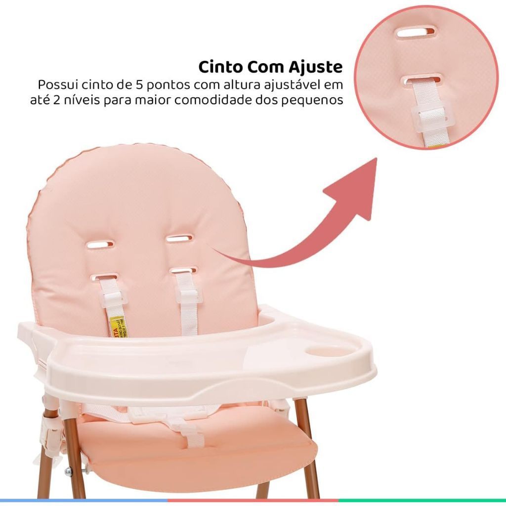 Produto Nacional; Estrutura em Aço; Cadeira alta ideal para bebês de até 23kg; Assento e encosto acolchoado em plástico laminado, facilitando a limpeza; Bandeja e apoio de pés; Bandeja removível que permite aproximação a mesa de refeição; Bandeja com porta copos; Cinto de segurança de 5 pontos; Cinto de segurança com 2 regulagem de altura; Fácil de desmontar; Trava de segurança; Cadeira desmontável – embalagem mais compacta; FOTO DO PRODUTO Composição têxtil 100% PVC. Registro do produto no INMETRO Nº 002366/2022 | OCP0040 SGS Medidas Alt. 97cm Larg. 74cm Comp. 63cm Peso. 4,40kg