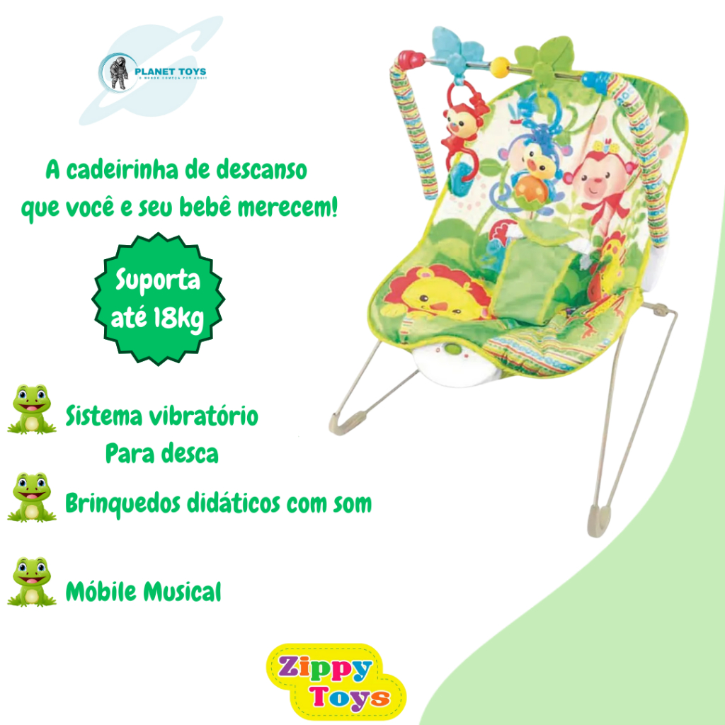 Cadeira de Balanço e Descanso Com Móbile Vibração Suave e Musical da Zippy Toys A Cadeira Baby com móbile estimula o desenvolvimento da visão, audição e tato do bebê. Vem com brinquedinhos tipo móbile que tocam músicas de ninar e cinto de segurança regulável. Ela também emite vibrações que acalmam o bebê e tornam a hora do cochilo mais tranquila. Principais características: - Marca: Zippy Toys - Cinto de Segurança de 3 pontos, regulável. - Idade recomendada: dos 0 meses à 3 anos - Capacidade máxima: 18kg - Cadeira: Utiliza 01 pilha "D" (não incluídas) - Brinquedinho: Utiliza 03 baterias "AG13/LR44" (incluídas) - Medida: 62 cm x 45 cm x 64,5 cm - Composição do tecido: 100% Poliéster - Registro INMETRO: 003 175/2024 ✅ Produto 100% Original com Nota Fiscal ✅ Produto disponível em estoque ✅ Produto a pronta entrega ✅ Produto com garantia de fabrica ✅ Produto com selo do Inmetro ✅ Envios feitos todos os dias ✅ Satisfação 100% Para outras dúvidas, entre em contato com nosso time de especialista. Boas compras!