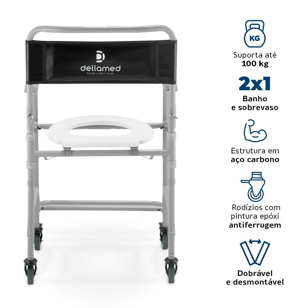 Cadeira de Banho Higiênica Dellamed Dobrável até 100 Kg Preto e Cinza D30 A Cadeira de Banho D30 Dellamed é uma solução inovadora, especialmente projetada para atender às necessidades de pessoas com mobilidade reduzida, como idosos e cadeirantes. Sua versatilidade 2 em 1 oferece tanto a funcionalidade de cadeira de banho para uso no chuveiro, quanto de cadeira sanitária sobre o vaso, proporcionando praticidade e conforto em um único produto. Equipada com 2 rodízios blindados com trava dupla, a D30 possibilita mobilidade total em espaços reduzidos, facilitando a locomoção do usuário. Sua estrutura reforçada e desmontável, aliada ao encosto em corino de alta resistência, garantem durabilidade e segurança durante o uso. Além disso, sua fácil montagem e pintura epóxi de alta resistência asseguram uma cadeira geriátrica de de excelente custo-benefício. - Suporta até 100kg. - 2 em 1: Banho e sobrevaso. - Estrutura em aço carbono, oferecendo maior robustez e durabilidade. - Rodízios 360º permitem mobilidade total em ambientes com espaço reduzido. - Estrutura inferior soldada para maior resistência e estabilidade. Especificações Técnicas: Marca: Dellamed Modelo: D30 Capacidade: Até 100Kg Cor: Estrutura Cinza/ Encosto Preto e Assento Branco Fácil montagem: Sim Dobrável e desmontável: Sim Apoios ergonômicos para os braços: Sim Pintura: Epóxi de alta resistência Possui suporte para comadre: Não Dimensões e Peso do Produto: Altura: 90,5 cm Largura: 51 cm Profundidade: 65 cm Peso: 5,6 kg Garantia: 6 meses para a estrutura. 3 meses de garantia legal para os demais componentes.