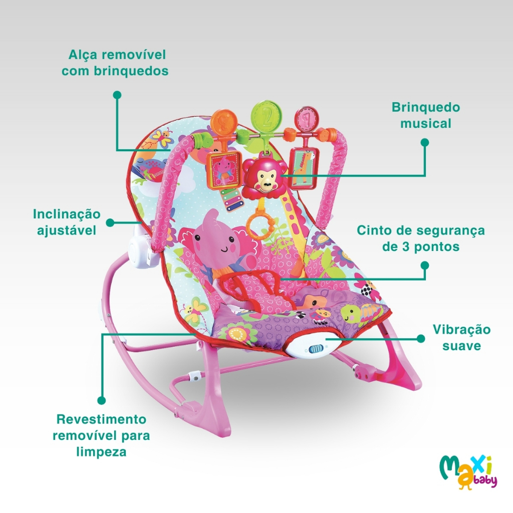 Cadeira de Descanso e Balanço Para Bebê Vibra e Toca Música FunTime Rosa Maxi Baby A Cadeira de Descanso Funtime da Maxi Baby foi desenvolvida para proporcionar o máximo de aconchego, carinho e segurança nos primeiros meses de vida do seu bebê. Com um design encantador e vibrante, ela combina suavidade com estímulos sensoriais essenciais para o desenvolvimento infantil. Modo Balanço: Reproduz movimentos suaves e ritmados, ajudando a acalmar o bebê em momentos que ele estiver mais agitado. Modo Descanso Reclinada e Vertical: Ideal para relaxar, promovendo um soninho mais tranquilo e auxiliando nas horas das refeições. Pode ser usada em 2 posições: reclinada para recém-nascidos ou na posição vertical para crianças que já sentam sozinhas, acompanhando o crescimento até os 18kg. A barra interativa removível conta com três brinquedos coloridos que estimulam o tato, a visão e a curiosidade, enquanto a caixa vibratória emite melodias suaves e sons da natureza, criando um ambiente relaxante e agradável para o bebê. Além disso, ela é equipada com cinto de segurança de 3 pontos, garantindo que a criança esteja protegida em todos os momentos. Seu acolchoado é totalmente removível e fácil de lavar, facilitando a higiene e a manutenção. Com estampa lúdica, a Cadeira Funtime é a escolha perfeita para transformar os momentos do bebê em experiências cheias de conforto, diversão e bem-estar, proporcionando tranquilidade para toda a família. Principais Características: - Idade recomendada: A partir do nascimento - Modo Balanço: 0 aos 18kgs - Modo Descanso Reclinada: 0 à 7kgs (Indicado para Recém Nascidos) - Modo Descanso Vertical: Quando a criança já senta sozinha - Reclinável em até 2 posições - Cinto de segurança de 3 pontos - Caixa vibratória musical: com sons da natureza e melodias suaves - Vibração calmante: ajuda a acalmar e relaxar o bebê - Assento acolchoado macio, confortável e com capa removível para limpeza - Barra Interativa Removível com 3 Brinquedos - Sendo um dos Brinquedos Musical por corda 2 Baterias LR44 (inclusas). - Caixa com Suave Vibração. Necessários 1 pilha "D" (não inclusas). - Estimula o desenvolvimento cognitivo do bebê - Estrutura leve e resistente - Peso máximo suportado: 18kgs - Produto certificado pelo INMETRO Especificações Técnicas: - Conteúdo da Embalagem: 1 Cadeira de Descanso Funtime + Manual de Instruções - Dimensões do Produto Aberto (AxLxP): 65,0 x 45,0 x 50,0cm aprox. - Composição: ABS, Metal e Poliéster - Peso: 2,800kgs - Garantia: 90 Dias (Contra Defeito de Fabricação Pelo Fabricante) - Certificação: INMETRO Nº 6378/BRI - Referência do Fabricante: 20499 - EAN: 7899403204992 - Marca: Maxi Baby ATENÇÃO! Leia atentamente o manual de instruções antes do uso (incluso). ESTE PRODUTO REQUER A SUPERVISÃO CONSTANTE DE UM ADULTO! Imagens meramente ilustrativas, as cores e estampas podem variar de acordo com o lote do fabricante.