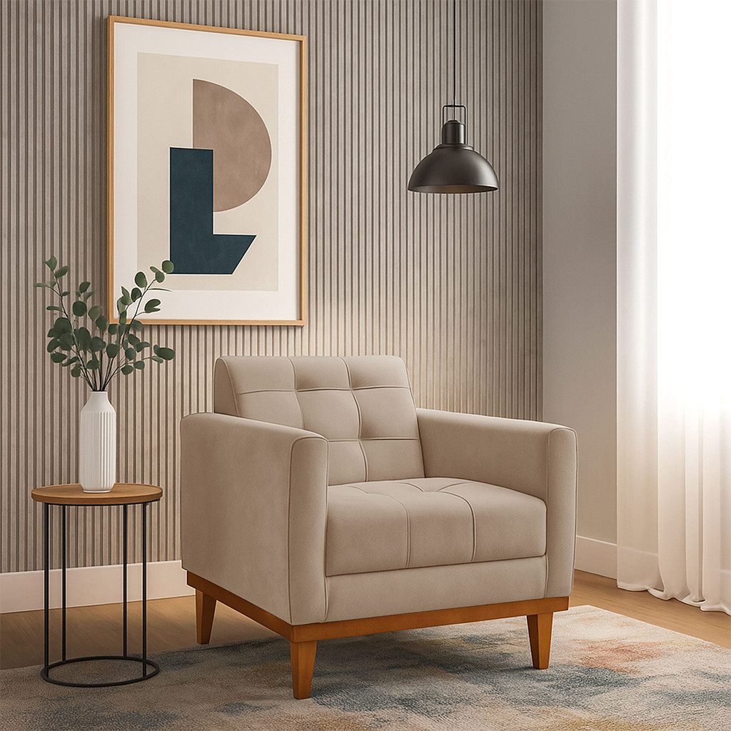 Adicione um toque de luxo e conforto inigualável ao seu lar com a Poltrona Assunção. Revestida com o sofisticado e macio tecido Veludo, esta poltrona é a escolha ideal para quem busca um design elegante que une o clássico e o moderno. Suas costuras que dividem o assento e o encosto em gomos criam um visual distinto e uma peça de destaque, que transforma qualquer ambiente com seu brilho sutil e textura rica. Ideal para compor sua sala de estar, quarto, ou para criar aquele cantinho de leitura luxuoso e convidativo que você sempre sonhou. Principais Benefícios para o seu Lar: - Design Elegante e Moderno: As linhas retas, combinadas às costuras que criam um visual de gomos no assento e encosto, e à base de madeira, conferem um estilo sofisticado que se adapta a diversas decorações. O veludo adiciona uma dimensão extra de requinte. - Conforto Aveludado: Sinta o conforto da espuma com densidade D-23, projetada para oferecer o suporte ideal para longos períodos de relaxamento. O toque suave e aconchegante do tecido Veludo eleva a sensação de bem-estar. - Versatilidade e Funcionalidade: Com dimensões equilibradas, a Poltrona Assunção se encaixa perfeitamente em diferentes espaços, servindo como um ponto de destaque ou complementando a decoração existente com elegância. - Qualidade em Cada Detalhe: A fabricação artesanal ("feito a mão") garante um produto exclusivo, com costuras precisas e um acabamento de alta qualidade que valoriza seu espaço e garante durabilidade. Características Técnicas: Modelo: Poltrona Assunção Revestimento: Tecido Veludo de alta qualidade Espuma do Assento e Encosto: D-23 Pés: Madeira maciça em formato retangular Diferencial: Fabricação artesanal com detalhes de costura no assento e encosto. Dimensões do Produto Montado: Altura: 76 cm Largura: 75 cm Profundidade: 75 cm Altura do Encosto: 39 cm Largura do Assento: 55 cm Profundidade do Assento: 52 cm Espessura do Assento: 45 cm Peso: 15 kg Informações Importantes sobre a Entrega: - Montagem Simples: A poltrona é enviada com o corpo montado, exigindo apenas o simples rosqueamento dos pés. Rápido e fácil! - Embalagem Segura: O produto vai embalado com total segurança para chegar em perfeito estado até você. (Dimensões Embalada: 67x78x78 cm) - Atenção: Confira as dimensões do produto e da embalagem, e certifique-se de que passarão por corredores, portas e elevadores no local da entrega.