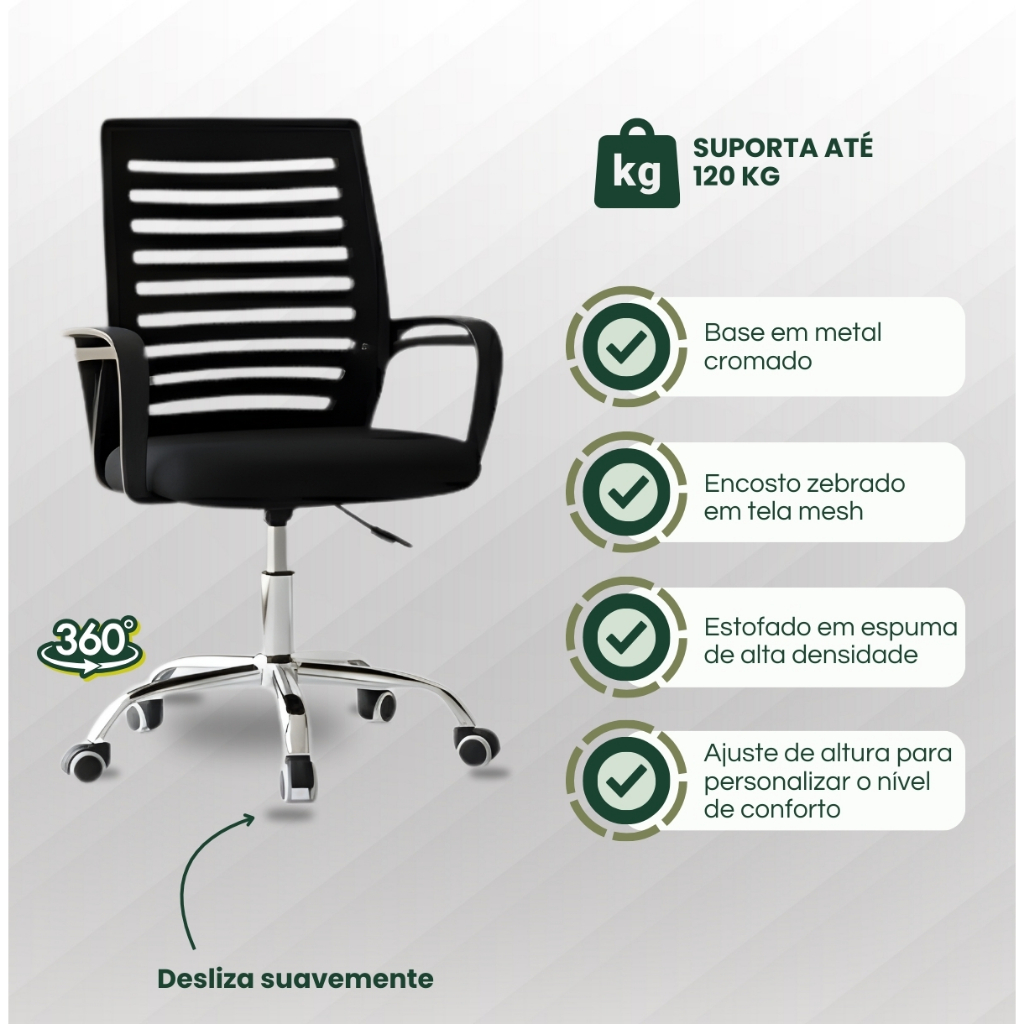 Está procurando uma cadeira de escritório ergonômica, confortável e moderna para o seu dia a dia? Características do Produto: – Marca: MMI – Material: Estrutura em aço, assento de espuma e encosto em plástico ventilado – Tamanho: Altura 99 cm x Largura do encosto 45 cm x Largura do assento 47,5 cm – Ajustes: Altura regulável por pistão a gás – Base: Giratória com rodízios de nylon – Cor: Preta Por Que Escolher Este Produto? – Encosto ventilado que reduz calor e garante bem-estar – Perfeita para escritórios, home office, salas de reunião e estudo – Rodízios e base giratória para deslocamento prático – Ergonômico, com apoio de braços para longas jornadas Dicas de Uso: – Ajuste a altura para alinhar com a mesa e manter postura correta – Combine com mesas ergonômicas para mais conforto – Ideal para uso doméstico ou corporativo Perguntas Frequentes (FAQs): – A cadeira suporta qual peso máximo? Suporta até 120 kg, garantindo segurança e estabilidade. – A montagem é difícil? Não, acompanha manual com instruções simples e práticas. – O encosto é reclinável? Sim, possui mecanismo de inclinação relax para maior conforto. Garanta já a sua e trabalhe ou estude com mais conforto, ergonomia e estilo!