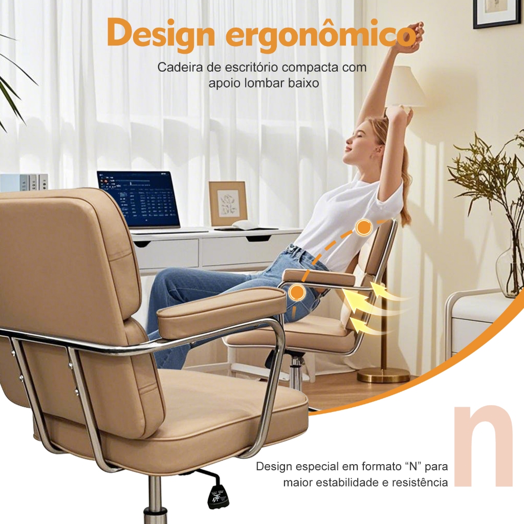 As cadeiras de escritório são um dos itens de escritório mais apreciados por arquitetos e designers de interiores, seja em um escritório doméstico ou em um espaço comercial. Elas são conhecidas por seu design superior, considerações ergonômicas e alta qualidade. Características do produto: Essa cadeira de escritório é uma escolha popular para quem procura um estilo de design exclusivo que adicionará um toque de cor ousado a um escritório ou ambiente doméstico. Além de seu design marcante, a construção espessa do assento e do encosto oferece excelente suporte para o corpo e é feita com materiais de alta qualidade. Esse também é um dos estilos extremamente populares entre os arquitetos para projetos de escritórios e home offices. Recursos funcionais: Inclui apoios de braço com altura ajustável; almofada de assento espessa feita de espuma de alta qualidade e couro sintético para melhor suporte e conforto; apoio para as costas especialmente projetado para longas horas de trabalho; Cor: Chá com leite Composição do material: Couro sintético de poliuretano de alta qualidade na parte frontal e suporte de metal cromado na parte traseira; Dimensões e suporte de peso: Largura: 64 cm Profundidade: 10 cm Altura da cadeira: 84-92 cm Altura da almofada do assento em relação ao piso: 43,5-53 cm. Altura do encosto: 43 cm Espessura do assento e do encosto: 10 cm Capacidade máxima de carga: 150 kg