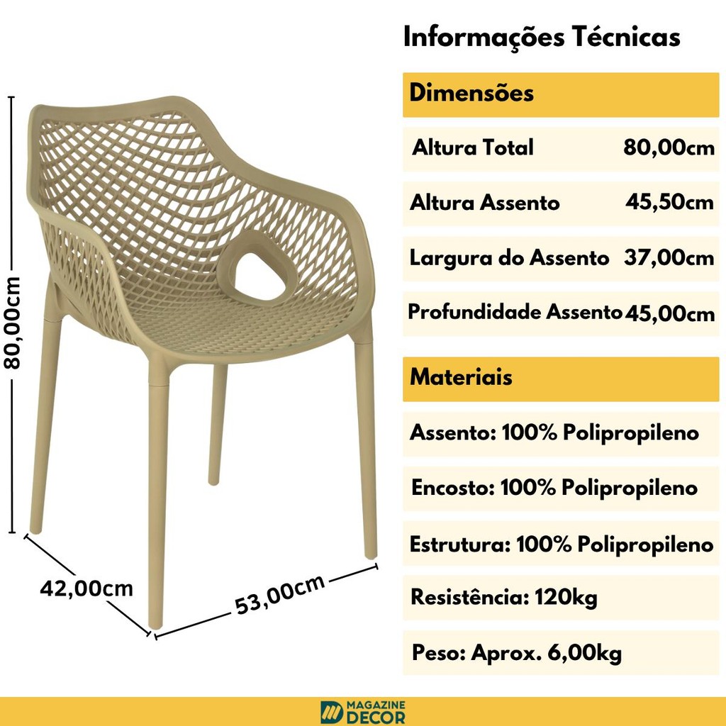 Cadeira de Jantar Suits com Braço A Cadeira de Jantar Suits com Braço foi pensada para quem busca praticidade sem abrir mão de estilo. Compacta por fora e acolhedora por dentro, ela se adapta a salas de jantar, varandas gourmets cobertas e espaços de uso diário. O desenho vazado dá leveza visual e um toque contemporâneo ao ambiente. As linhas contínuas formam concha única com braços integrados e bordas arredondadas, criando uma peça fluida que combina facilmente com mesas redondas ou retangulares e com diferentes estilos de decoração. A concha anatômica abraça o corpo e favorece a postura à mesa, enquanto os braços oferecem apoio extra para conversas mais longas e refeições descontraídas. A superfície vazada melhora a ventilação do encosto e do assento, contribuindo para uma sensação de frescor no uso diário. Fabricada 100% em polipropileno, a Suits é firme, leve e simples de limpar: pano macio levemente umedecido com sabão neutro é suficiente. O material dispensa manutenção complexa e preserva o acabamento no dia a dia quando utilizada em ambientes internos ou cobertos. Especificações: > Material: 100% Polipropileno > Peso: Aproximadamente 6.00kg > Resistencia: Aconselhável até 120.00kg Medidas: > Altura Total(cm): 80,00 > Altura do Assento(cm): 45,50 > Profundidade do Assento(cm): 45,00 > Largura assento(cm): 37,00 > Distância braço(cm): 53,00 > Altura até o braço(cm): 66,50 > Altura do encosto(cm): 38,00 > Profundidade total(cm): 42,00 Importante: Produto enviado desmontado acondicionado em caixa de papelão reforçada, acompanha manual de montagem (não nos responsabilizamos pela montagem do produto). > Observações de Entrega: Os entregadores não são autorizados: > Entrar no domicílio, sem estar acompanhado pelo cliente; > Entrar ou subir desacompanhado em prédio residencial ou comercial, o cliente precisa receber o pedido na portaria; > Entregar por meios alternativos (exemplo: içar produto por janela, subir escadas); > Entregar em edifícios, entrega será realizada apenas na portaria; > Realizar montagens, instalação ou manutenção de produtos; > Abrir a embalagem do produto; > Realizar entrega em endereço diferente do que consta na Nota Fiscal; > Garantia: 03 Meses Contra Defeitos de Fabricação.