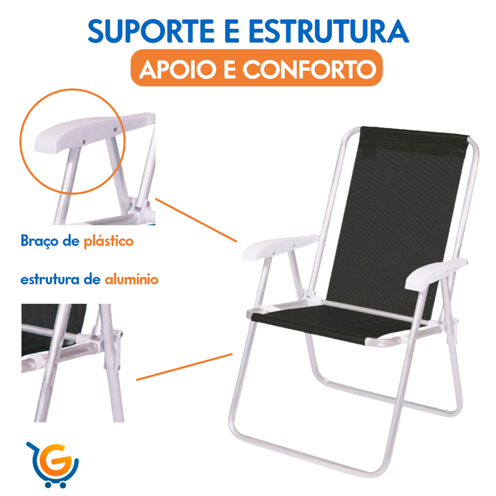 Cadeira De Praia Conforto Braço de Plástico Jardim Alumínio Preta Tela Sannet Portátil Dobrável Mor