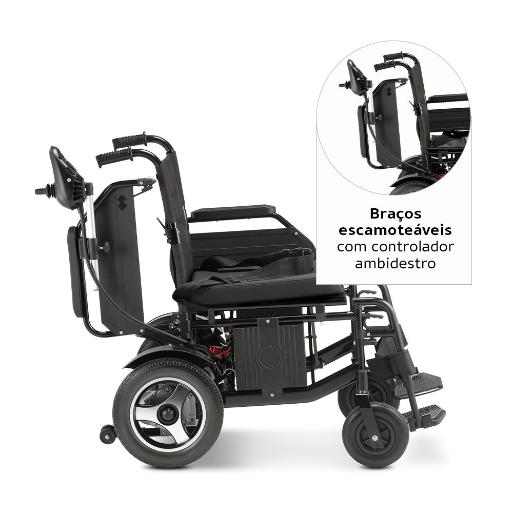 Ergonômico, ambidestro e dobrável A cadeira motorizada elétrica D800 é uma inovação em mobilidade, especialmente desenvolvida para atender às necessidades de pessoas com mobilidade reduzida, como idosos e adultos. Seu design ergonômico e resistente proporciona conforto e segurança, enquanto o encosto estofado e rebatível garante um suporte adequado e bem-estar durante o uso. O diferencial desta cadeira é o controle ambidestro, oferecendo facilidade de condução tanto para destros quanto para canhotos. Com sua funcionalidade elétrica, ela proporciona maior independência e autonomia ao usuário, contribuindo para um estilo de vida mais ativo e saudável. Diferenciais: Suporta até 120 kg Vai com você para todo lugar: cabe em qualquer porta-malas, inclusive de carros mais compactos Ecoboost - Nova tecnologia de motor. Mais leve e potente Estrutura tubular em aço carbono, oferece maior robustez e durabilidade Pés em alumínio forjado Os braços escamoteáveis permitem maior facilidade na movimentação lateral Equipada com uma almofada no assento, proporcionando maior conforto para o usuário durante o uso prolongado. Características: Cadeira pode ser dobrada sem a necessidade de tirar as baterias. Pés de alumínio com maior resistência Apoio de pés retráteis Motor escova, menor, mais leve e mais potente, novidade no mercado Encosto rebatível Controlador ambidestro Assentos em costura Oxford Pedais em alumínio Estrutura em Aço Carbono Rodas traseiras em PU maciço. Rodas dianteiras de borracha rígida Proteção lateral em polietileno de alta densidade Manopla de polietileno de alta densidade 2 baterias de chumbo ácido 12V20Ah Carregador 24V 2A 2 motores com 250W 24V Cinto de segurança Par de anti-tombo Especificações Técnicas: Capacidade: Suporta até 120 kg Cor: Preto Autonomia: 10~20 km Velocidade Máxima: 5~6 km/h Distância interna entre os braços: 47,5 cm Altura do assento ao piso: 48 cm Largura x Profundidade do assento: 48 x 45 cm Altura do encosto das costas: 48 cm Espaço livre do apoio para os pés ao piso: Mínimo: 12 cm e Máximo: 17 cm Altura entre o apoio para os braços e o assento: 22 cm Comprimento do apoio para os braços: 27 cm Diâmetro externo da roda traseira: 12 Polegadas Diâmetro externo da roda dianteira: 8 Polegadas Peso do produto sem o par de baterias: 35,15 kg Medidas da cadeira dobrada C x L x A: 75 x 40 x 70 cm Comprimento: 107 cm Largura: 68 cm Altura: 91 cm Peso Líquido: 41 kg Medidas embalado C x L x A: 77 cm x 38 cm x 80 cm Peso Bruto embalado: 45 kg Conteúdo da Embalagem: 2 bateria de chumbo ácido 12V20Ah 1 Cadeira de rodas D800 1 Carregador 1 Manual Garantia: 12 meses para estrutura (incluso os 3 meses de garantia legal) 3 meses de garantia legal para demais componentes