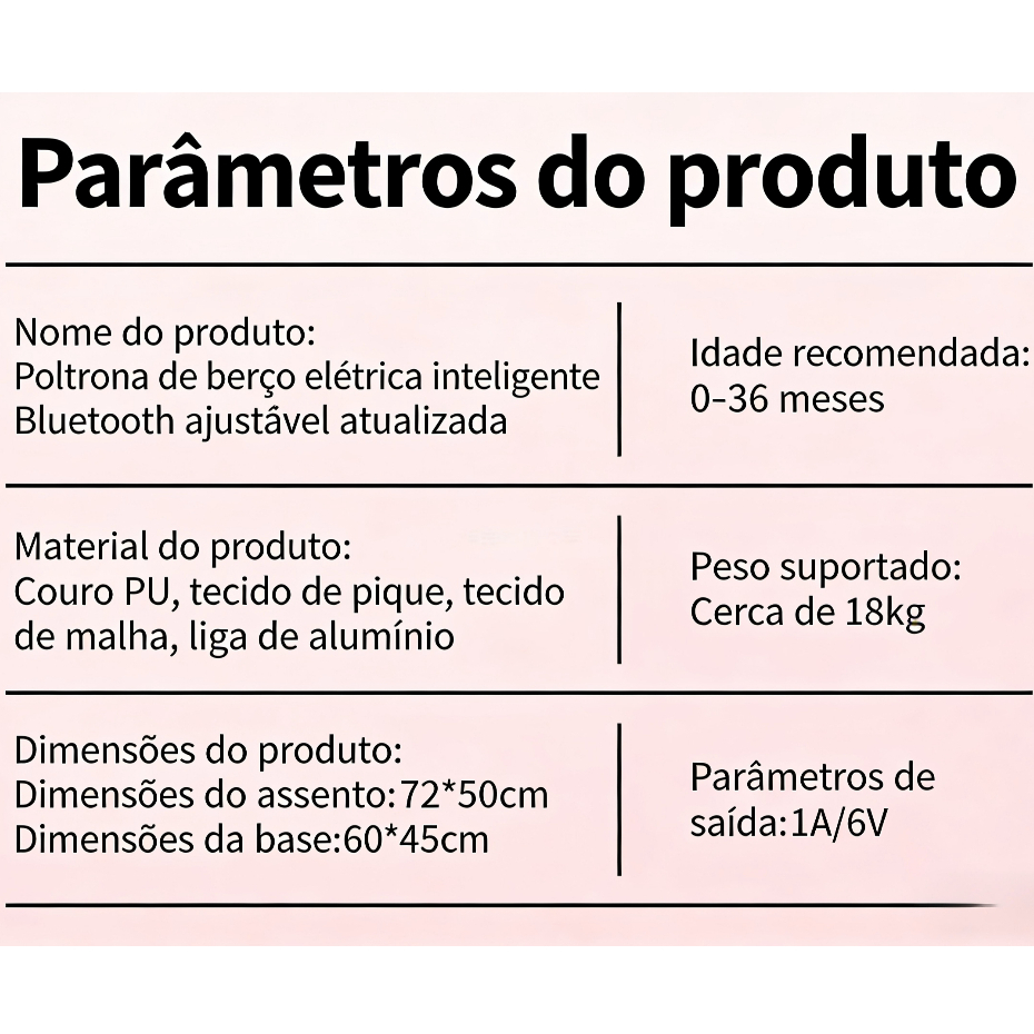 A Cadeira Elétrica de Balanço é a aliada definitiva para pais modernos que buscam conforto para o bebê e praticidade para a rotina. Com um sistema inteligente de oscilação lateral, ela oferece o aconchego necessário para acalmar o recém-nascido, enquanto as funções de Bluetooth e controle remoto permitem que você ajuste a experiência sem precisar sair do lugar. O design ergonômico conta com um encosto reclinável e cinto de 5 pontos, garantindo que o bebê esteja sempre na postura correta e totalmente seguro. Tecnologia Inteligente de Ninar: Movimento lateral automático que simula o balanço natural do colo humano, com controle remoto para total conveniência. Multifuncional 3 em 1: Não é apenas um balanço; ela evolui com o bebê, servindo como berço de descanso, cadeira de balanço e assento fixo . Conectividade Bluetooth e Música: Sistema de som integrado que permite tocar as canções de ninar favoritas do seu bebê diretamente do seu celular. Portabilidade Total: Design dobrável ("Easy Fold") que permite guardar o produto embaixo da cama ou levá-lo em viagens sem ocupar espaço. Conforto Premium: Materiais respiráveis (tecido de malha e pique) e acabamento em couro PU, garantindo frescor e facilidade de limpeza. 🛡️ Segurança em Primeiro Lugar Cinto de 5 Pontos: Segurança máxima que evita que o bebê escorregue ou tombe para os lados, mantendo-o firme mesmo durante os movimentos de balanço. Estrutura de Alta Resistência: Base em liga de alumínio reforçada, garantindo estabilidade total e durabilidade para acompanhar o crescimento da criança. Base Antiderrapante: Design da base de 60x45cm que oferece um centro de gravidade baixo e seguro. Idade Recomendada: 0 a 36 meses Peso Suportado: Até 18kg Materiais: Liga de alumínio, Couro PU e Tecidos Respiráveis Dimensões do Assento: 72 x 50 cm Alimentação: 6V / 1A (adaptador incluso)