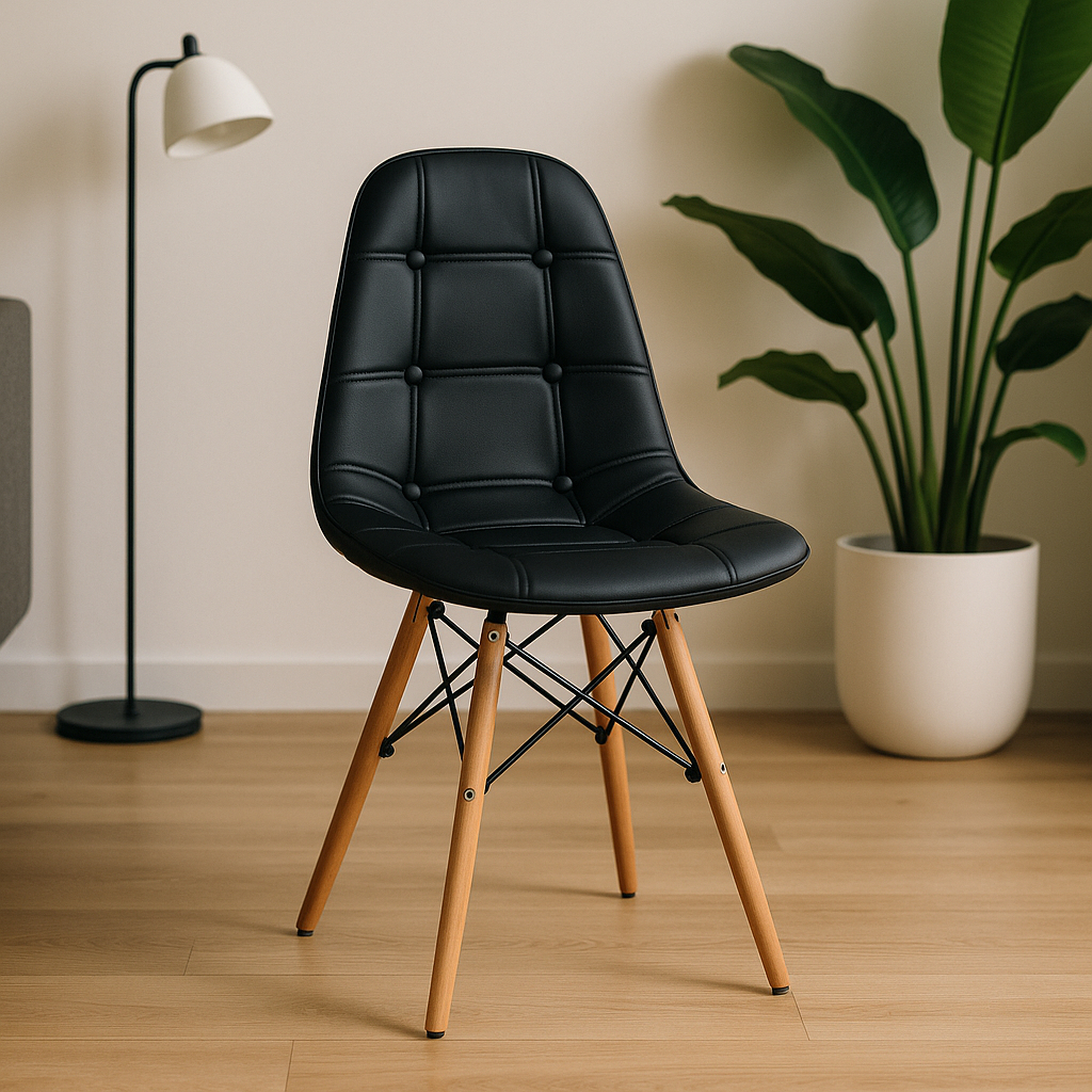 Cadeira Estofada Para Mesa De Jantar Cozinha Charles Eames Botonê Preta Base Madeira Wood
