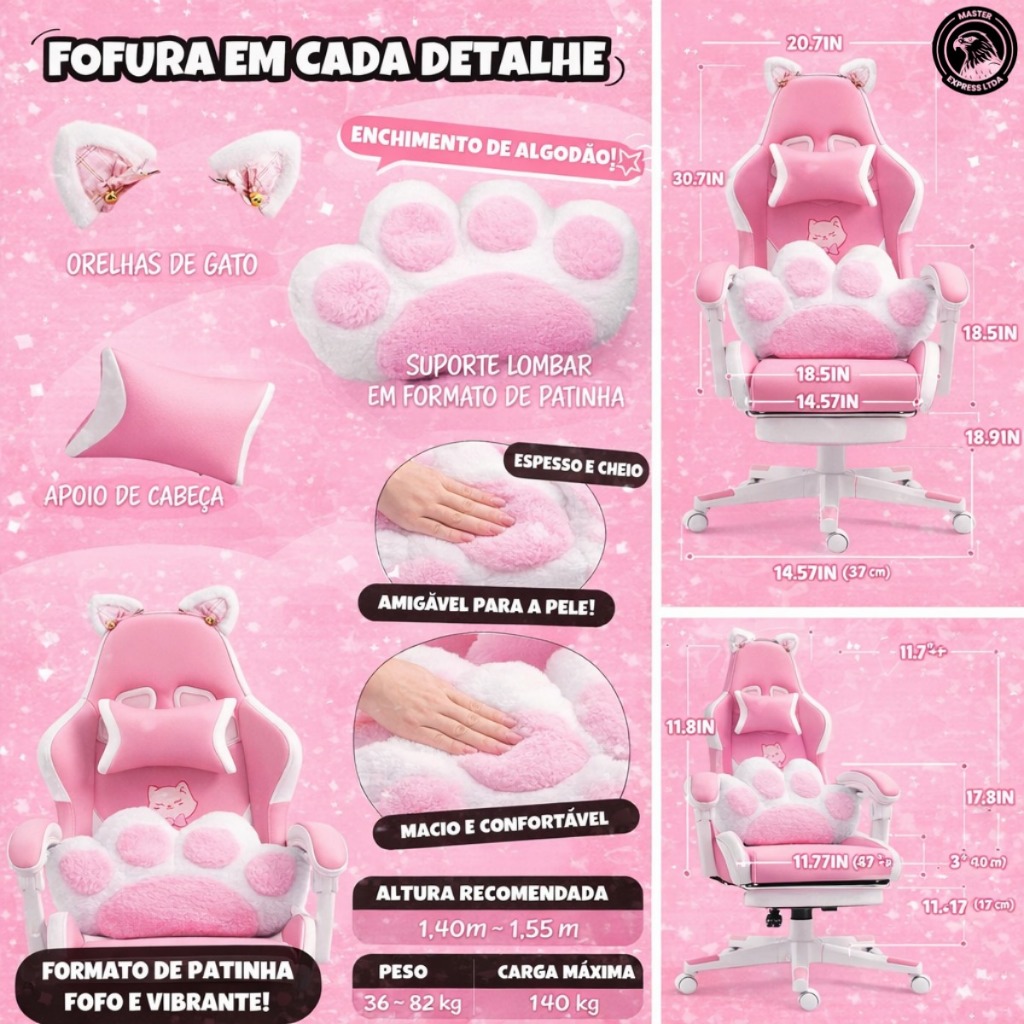 Transforme seu setup com essa cadeira gamer rosa super charmosa, perfeita para quem busca conforto, ergonomia e um visual kawaii irresistível. Com design inspirado em gatinho, ela une funcionalidade e estilo, sendo ideal para gamers, streamers, home office, estudos e escritório. ✨ Destaques do Produto: Design exclusivo estilo gatinho, com orelhinhas decorativas e estampa delicada. Almofada lombar em formato de patinha, super fofa, confortável e removível. Encosto alto ergonômico, oferecendo excelente suporte para coluna, pescoço e lombar. Apoios de braço acolchoados, garantindo conforto durante longas horas de uso. Altura ajustável, adaptando-se perfeitamente a diferentes biotipos e mesas. Sistema reclinável, permitindo relaxar entre uma partida e outra. Base reforçada com rodízios silenciosos, proporcionando estabilidade, mobilidade e durabilidade. Estofamento macio e respirável, para máximo conforto diário. 🎯 Ideal para: Gamers Streamers Escritório Home office Estudos Setup gamer feminino 💗 A cadeira perfeita para quem quer unir conforto, performance e um visual encantador!