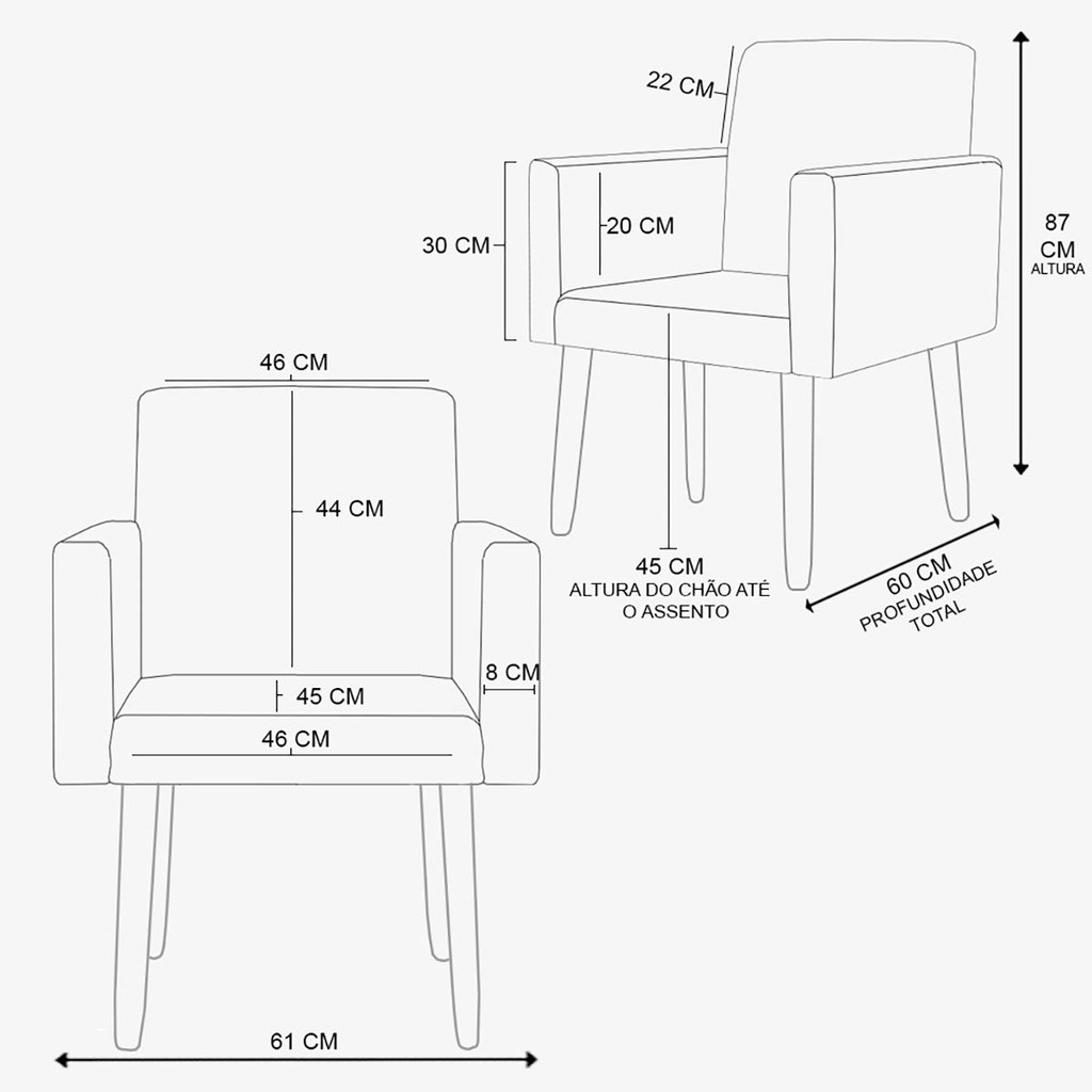 Transforme o seu ambiente com a Poltrona Nina Pé Palito. Esta poltrona é a combinação perfeita de conforto, durabilidade e um design moderno, ideal para mesas de jantar, áreas de estar e até mesmo ambientes comerciais. Especificações do produto Tecido em Suede, 100% poliéster. Espuma D-23 com Alta densidade Percintas Elásticas que oferecem suporte adicional Estrutura de madeira eucalipto proveniente de reflorestamento Informações Técnicas Altura: 87 cm Largura: 61 cm Profundidade: 60 cm Peso: 9,5 kg Capacidade de Suporte: O produto suporta até 100 kg Produto embalado Altura: 62 cm Largura: 51 cm Profundidade: 55 cm Peso: 9,5 kg Observações Importantes O produto tem 3 meses de garantia contra defeitos de fabricação Produto possui uma embalagem segura, feita para evitar danos durante o transporte O Produto entregue é montado A cor real pode variar ligeiramente devido às configurações da tela e ao tratamento das imagens O Prazo de envio é de 5 dias úteis após a confirmação da compra e enviamos para todo o Brasil Perguntas Frequentes Como devo limpar? Realizar a limpeza do tecido com um pano seco ou levemente umedecido Quantos produtos irei receber nesta compra? Você receberá 1 volume, ou seja, apenas uma Poltrona Nina Pé Palito Para mais informações ou assistência com sua compra, nossa equipe está à disposição para ajudar