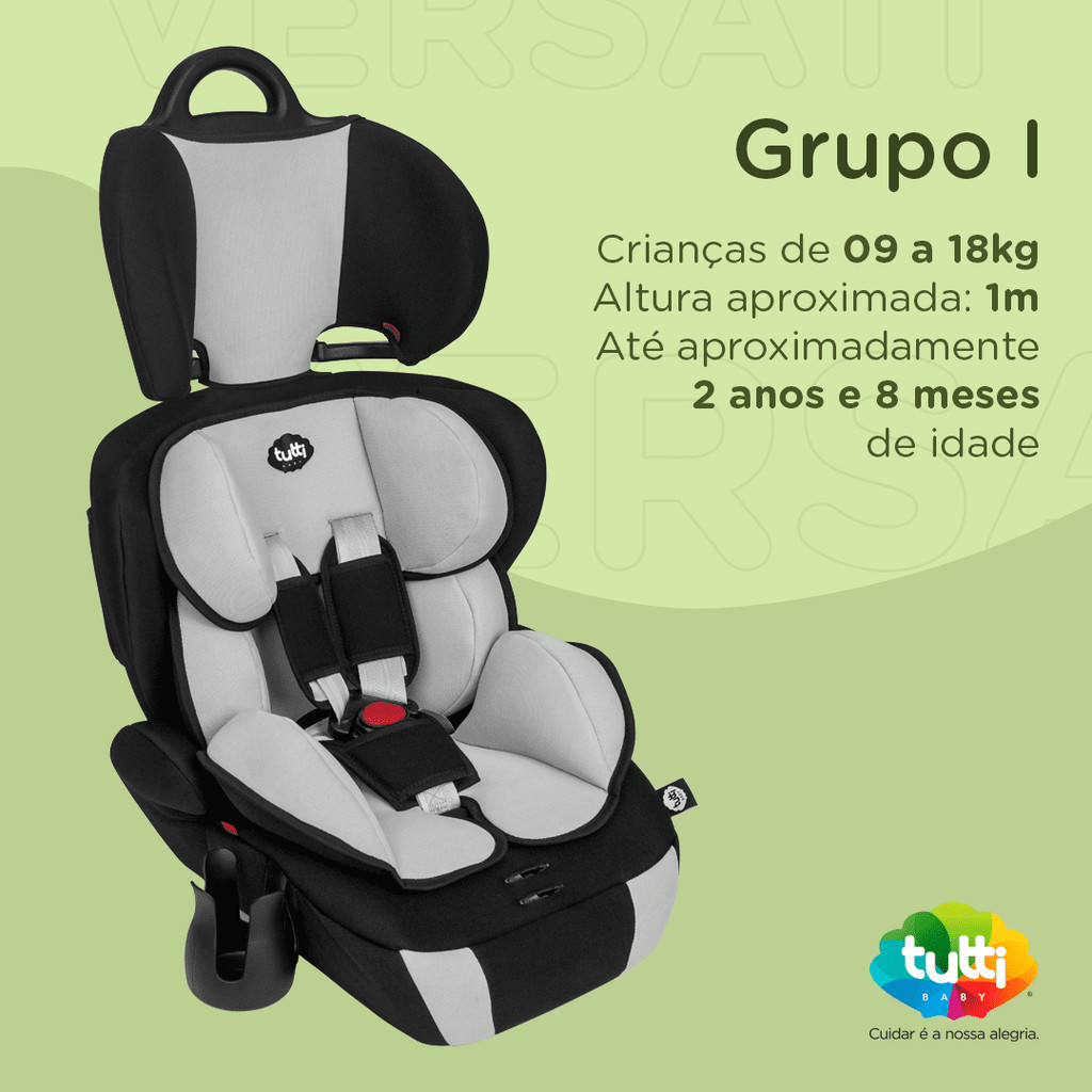 A Cadeira Versati da Tutti Baby é projetada para crianças de 9 a 36 kg (Grupos I, II, III), acompanhando o crescimento desde os 9 meses até aproximadamente 11 anos. Para o Grupo I (9-18 kg), utiliza o cinto de segurança da própria cadeira, enquanto nos Grupos II e III (15-36 kg), utiliza o cinto do carro. Possui um apoio de cabeça ajustável em 7 posições e redutores acolchoados para maior conforto. Além disso, inclui um porta-copos ao alcance da criança e cumpre com a norma NBR 14400 para segurança. É uma cadeira 100% nacional e fácil de limpar devido ao tecido acolchoado removível e lavável. Descrição Técnica: Certificação: 004123/2020 Peso mínimo recomendado: 9 Quilogramas Peso máximo recomendado: 36 Quilogramas Tipo de material: Plástico, Poliéster, Metal Composição: 100% Poliéster Número de posições: 7 Orientação: Virado para a frente Tipo de arreio: 5 pontos Fabricante: Tutti Baby Dimensões do produto: 39 x 46 x 74 cm; 4.3 kg Marca: Tutti Baby Somos uma Loja de Comercio Online, voltada a artigos infantis, temos parceria com as melhores marcas do mercado neste segmento, buscamos sempre trazer novidades e inovação. - AVISO: Imagens meramente ilustrativas. As cores podem variar entre as imagens mostradas acima e o produto. - ATENÇÃO PARA OS DADOS DE ENTREGA: Confira o seu endereço de entrega cadastrado, não alteramos endereços após a compra. - HORÁRIO DE ATENDIMENTO: De Segunda à Sexta das 08:00 às 17:00h. _______________________________________________________________ Dúvidas Frequentes: 1 - Como Calcular seu Frete? R. Basta inserir seu CEP para o cálculo no campo frete e o site lhe informará as melhores opções de envio e seus respectivos preços. 2 - A mercadoria está disponível à pronta entrega? R: Todas as mercadorias são para pronta entrega. 3- O produto acompanha nota fiscal? R: Sim, todos os itens possuem nota fiscal.