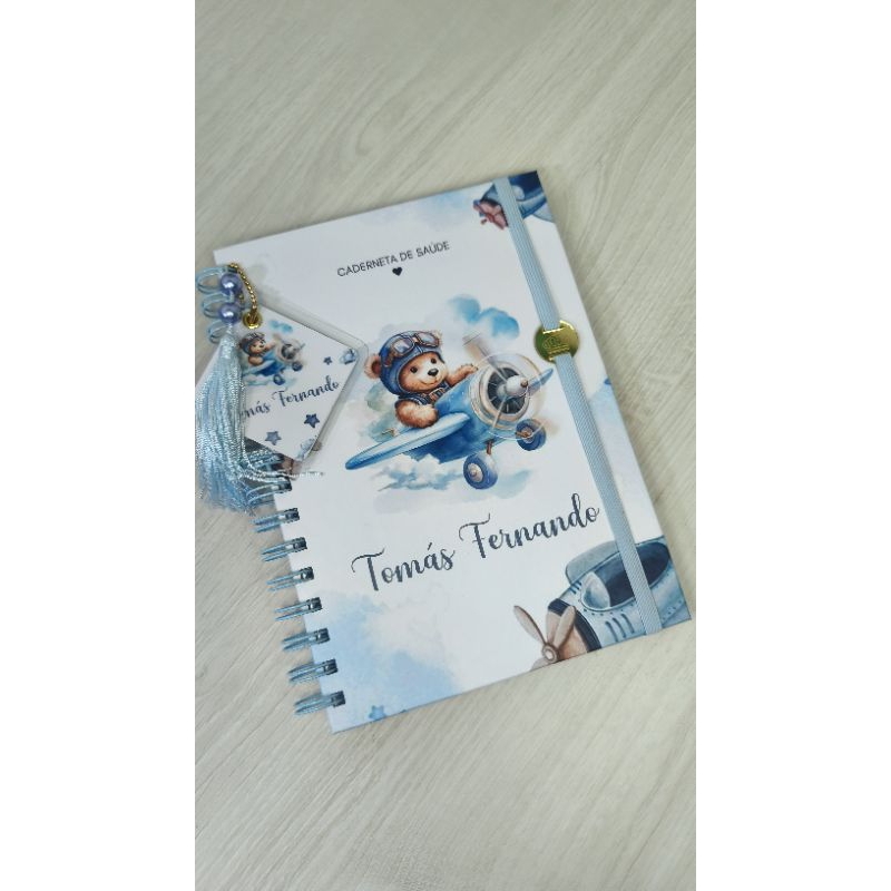 Caderneta de Saúde Personalizada Ursinho aviador Vacinação Consultas Capa Dura com Nome