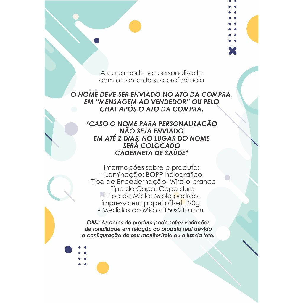 *A capa pode ser personalizada com o nome de sua preferência CASO O NOME PARA PERSONALIZAÇÃO NÃO SEJA ENVIADO EM ATÉ 2 DIAS, NO LUGAR DO NOME SERÁ COLOCADO CADERNETA DE SAÚDE - Laminação: Holográfica - Tipo de Encadernação: Wire-o - Tipo de Capa: Capa dura. - Tipo de Miolo: Miolo padrão, impresso em papel offset 120g. - Medidas do Miolo: 150x210 mm. As cores do produto pode sofrer variações de tonalidade em relação ao produto real devido à configuração do seu monitor/tela ou a luz da foto.