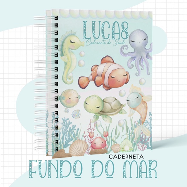 Caderneta de saúde/ vacinação capa dura personalizada c/nome completa c/elástico tessel passante tema fundo do mar