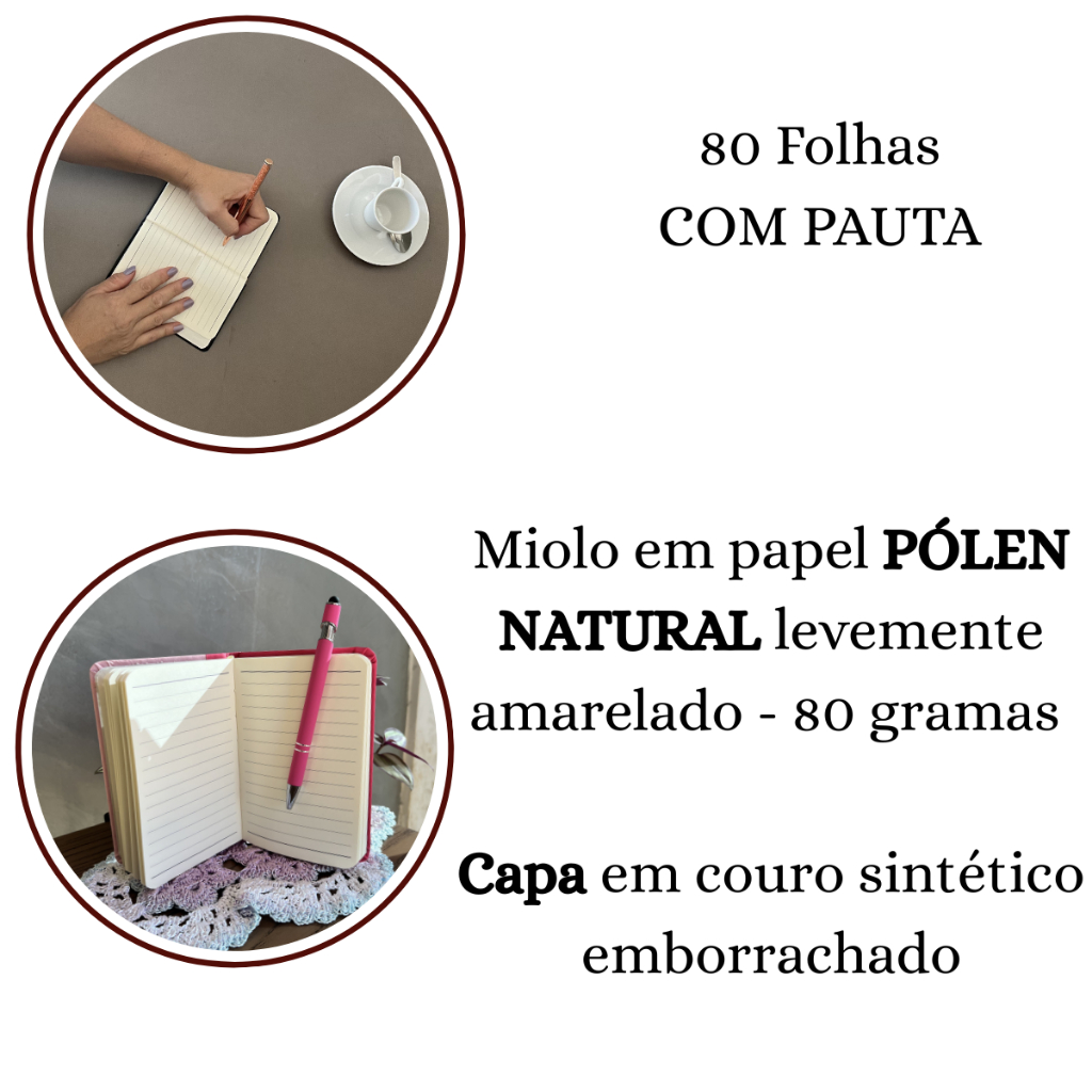 Caderneta Pequena Tipo Moleskine Personalizada 10x15cm com Pauta – Capa em Couro Sintético e Elástico Se você procura caderneta tipo moleskine personalizada para brinde, uso profissional ou organização diária, este modelo é ideal para quem deseja um produto compacto, elegante e customizado com nome, frase ou sua logo. Com formato prático e acabamento em couro sintético emborrachado, a caderneta combina apresentação profissional com funcionalidade. O miolo com pauta (linhas) facilita anotações, reuniões, estudos e planejamento diário, sendo perfeita como agenda compacta ou bloco de anotações personalizado. Diferenciais do Produto – Personalizado a laser com nome, frase, arte ou sua logo – Acabamento sofisticado em couro sintético emborrachado – Elástico para fechamento seguro – Miolo com pauta (linhas) para escrita organizada – Papel Pólen Natural 80g levemente amarelado, mais confortável para leitura – Tamanho compacto ideal para bolsa, mochila ou pasta – Excelente opção para brindes corporativos, lembrancinhas, boas-vindas em empresa e uso diário PERSONALIZAÇÃO * A gravação é feita a laser diretamente no material. * Não é colorida: o resultado final varia conforme a reação do laser com o couro sintético, garantindo um efeito discreto e elegante. IMPORTANTE: Após a compra, é obrigatório enviar imediatamente pelo chat as informações da personalização (nome, frase, arte ou sua logo). Caso não recebamos os dados no mesmo dia da compra, o produto poderá ser enviado sem personalização para que o prazo de envio não seja comprometido. CORES DISPONÍVEIS Trabalhamos com diversas cores, como rosa, marrom, preto, azul escuro e outras variações. Consulte disponibilidade no momento da compra. ESPECIFICAÇÕES TECNICAS Formato aproximado: 9,5 x 14,5 cm Formato comercial: 10 x 15 cm Miolo: com pauta (linhas) Quantidade de folhas: 80 folhas Gramatura do papel: 80g Tipo de papel: Pólen Natural levemente amarelado Capa: couro sintético emborrachado Fechamento: elástico O QUE ACOMPANHA – 01 Caderneta tipo moleskine personalizada com pauta PERGUNTAS FREQUENTES > A personalização é colorida? Não. A gravação é feita a laser e o resultado depende da reação do material, mantendo aspecto elegante e profissional. > Posso enviar minha logo da empresa? Sim. Você pode enviar sua logo, arte, nome ou frase pelo chat imediatamente após a compra. >Se eu não enviar a personalização no mesmo dia, o que acontece? Para não atrasar o envio, o produto poderá ser enviado sem personalização caso as informações não sejam recebidas no mesmo dia. > É agenda ou caderneta? É uma caderneta tipo moleskine com pauta. Pode ser utilizada como agenda compacta, planner simples ou bloco de anotações. > Serve para brinde corporativo? Sim. É uma excelente opção de produto customizado para brindes empresariais, eventos, kits de boas-vindas e ações promocionais. Escolha a quantidade ideal, envie sua personalização no chat após a compra e tenha uma caderneta personalizada prática, profissional e pronta para valorizar sua marca ou organização diária ;)