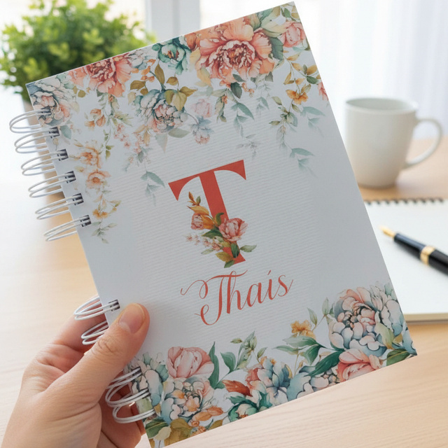 Caderno A5 Floral Rosa e Azul personalizado com inicial e nome