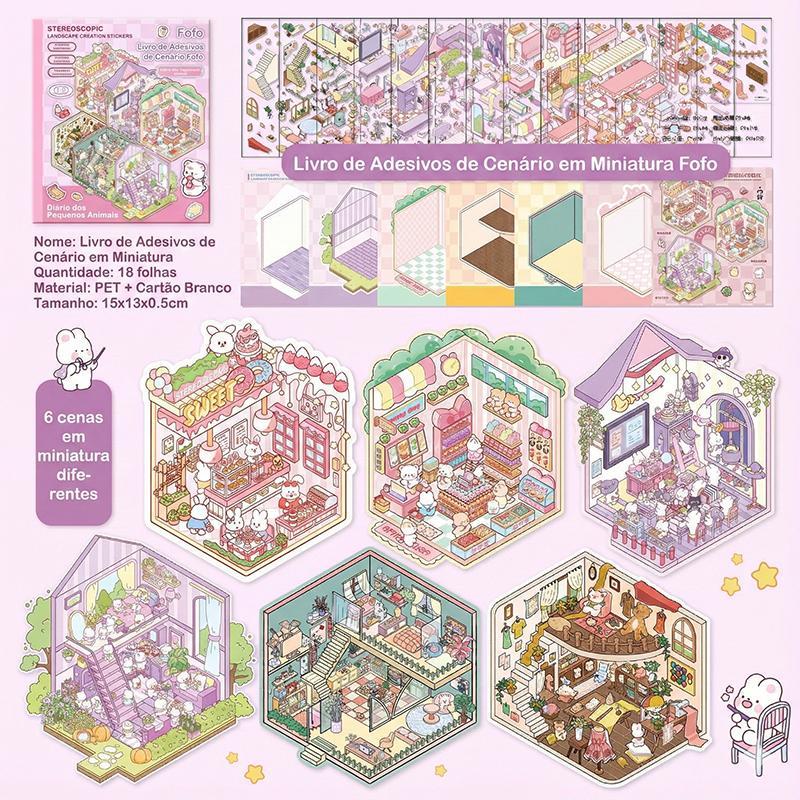 Caderno Adesivos 3D Sem Tela Brinquedo Educativo Presente Criança 6 Cenas 18 Páginas Bichinhos Fofos