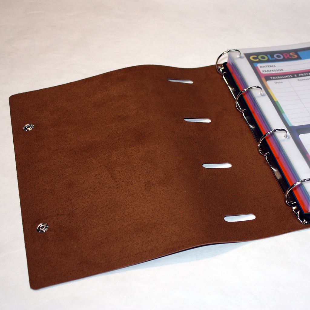 Entre caderno e fichário, fique com os dois. A Design Feito à Mão traz para você mais um produto exclusivo: Caderno Argolado. Ele une o que há de melhor no fichário, que é a possibilidade de trocar as folhas, usar refil, divisórias, etc, com a praticidade e mobilidade do caderno. Tem tudo o que um fichário possibilita, porém com capa flexível e super resistente, folhas decoradas e um formato mais compacto, que permite carregá-lo na mochila! É caderno e fichário ao mesmo tempo! Características deste modelo > Capa em couro sintético ecológico > 250 folhas com pauta > 11 divisórias coloridas de plástico > Envelope plástico > Garra em metal com 4 argolas > Tamanho das folhas: 20 x 27,5cm > Tamanho total, incluindo a capa transparente: 24 x 30 x 4cm > Fechamento com botão de pressão