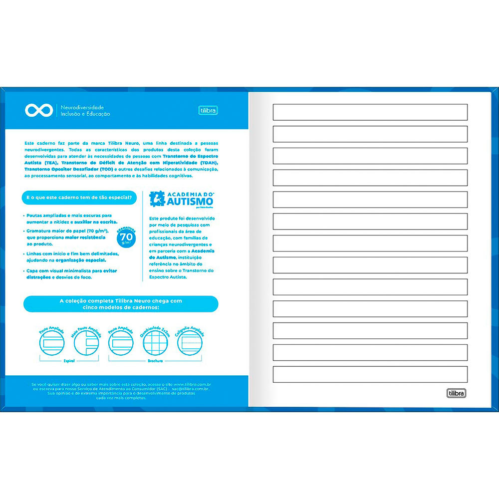 O Caderno Pauta Ampliada Brochura Capa Dura Tilibra Neuro 80 Folhas possui capa dura e folhas com espaçamento maior que as linhas convencionais. Esse produto faz parte da coleção Tilibra Neuro, desenvolvida por meio de pesquisas com profissionais da área de educação, famílias atípicas e parceria com a Academia do Autismo. Todos os produtos da coleção Tilibra Neuro possuem as seguintes características: - Pautas ampliadas e mais escuras para aumentar a nitidez e auxiliar na escrita; - Gramatura maior do papel (70g/m²), que proporciona maior resistência ao produto; - Linhas com início e fim bem delimitados, ajudando na organização espacial; - Capa com visual clean para evitar distrações e desvios de foco. Detalhes: - Capa: dura - Miolo: com pauta ampliada - Parte interna da capa decorada - Formato: 200mm x 275mm - Gramatura: 70 g/m² - Número de folhas: 80 folhas * As cores podem sofrer alteração dependendo do monitor*