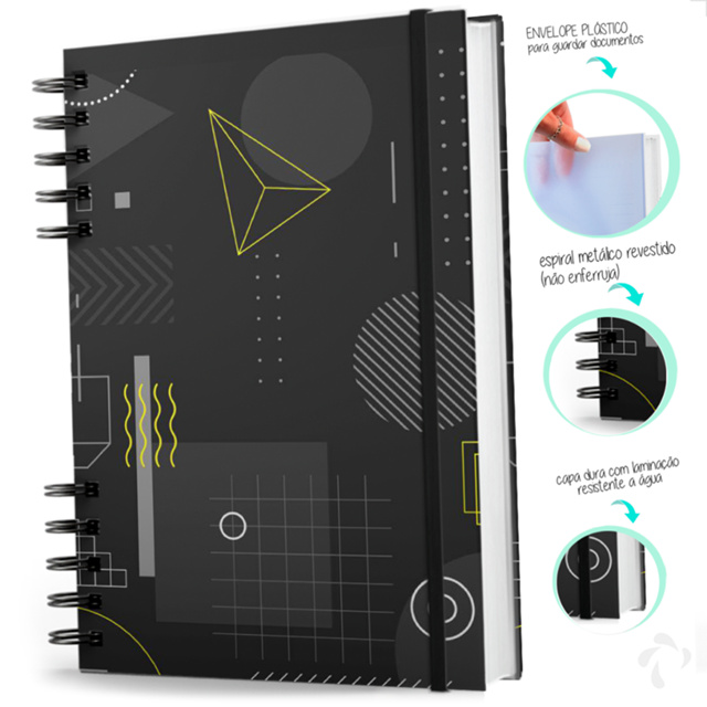 Caderno para Anotações - Geo Anote, Registre, Crie ou Presenteie alguém especial! A qualidade e acabamentos dos materiais com certeza é um grande diferencial de nossos produtos, temos 12 anos no seguimento prezando pela satisfação de nossos clientes. - Emitimos NF para todas as nossas vendas, sua compra aqui é garantida. Características do produto : Acompanha um envelope plástico para guardar documentos, papéis e itens importantes, com fechamento em elástico e wire-o, conferindo elegância e sofisticação. Na primeira página, você poderá inserir todos os seus dados pessoais, profissionais. Logo após, campos para dados emergenciais como: Alergias, grupo sanguíneo, contatos para aviso e muito mais! Na sequência, temos o calendário do ano vigente. Em todas as demais páginas, além das pautas, possui campos para você inserir a data e indicar o dia da semana! Detalhes do Produto : - Capa dura com laminação Bopp (ajuda a proteger contra umidade e sujeiras) - Medidas da capa 15 x 21 cm (Sem contar medidas do arame) - Tamanho do miolo A5 (14,8 cm x 21cm) - Cor do Miolo: Preto/Cinza. - Encadernação com wire-o 2x1 - 200 páginas = 100 folhas / Em papel Offset 75g! - Fechamento com elástico.