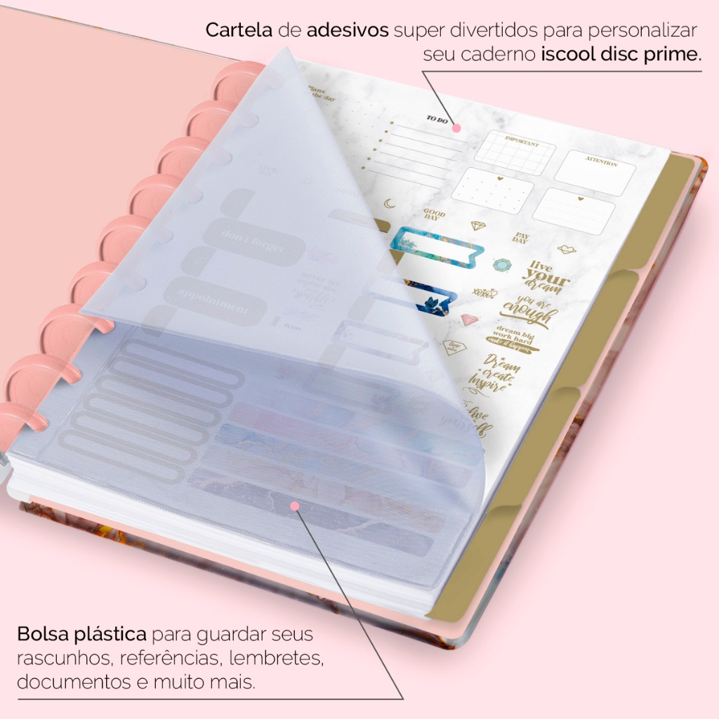 Caderno de discos ISCOOL DISC PRIME (capa dura 140 folhas/280 páginas) com sistema de folhas e discos reposicionáveis. >>> Esse anúncio/produto não é possível personalizar. >>> Não alteramos cor, fonte ou elementos gráficos da estampa deste anúncio. >>> ESPECIFICAÇÕES DO PRODUTO <<< - Você pode escolher entre os tamanhos M (17 cm x 23 cm) ou G (20 cm x 27,5 cm). - Capa dura com impressão digital de alta definição. - Elástico para fechamento da capa do caderno. - Bolsa plástica para guardar documentos e anotações. - Página com instruções de como utilizar seu caderno. - Cartela de adesivos divertidos. - Encadernado com 9 ou 11 discos de 32mm em polímero de nylon e/ou policarbonato coloridos, fabricados no Brasil. - 4 ou 6 divisores laminados (frente e verso) em papel 250g. - Quantidade de folhas: 140 folhas, sendo 120 folhas pautadas decoradas e 20 folhas em branco. - Quantidade de páginas: 280 páginas. - Páginas internas em papel sulfite (offset) 90g branco. ISCOOL DISC PRIME é a escolha perfeita para quem busca um modelo moderno, criativo, prático, versátil e original, com qualidade e ótimo custo-benefício. Um caderno totalmente customizável, no qual os elementos são reposicionáveis. Você pode montá-lo como preferir, deixando rolar solta toda sua criatividade. A capa é dura com impressão digital de alta definição, acompanha lindas divisórias que você pode colocar em qualquer local do caderno, funcionando como o guia perfeito para sua organização. O miolo conta com 120 folhas pautadas decoradas em papel sulfite 90g, (aquele papel mais “grossinho”) para que você use e abuse das suas canetas especiais e 20 folhas em branco, ideais para explorar seu lado mais criativo ou até imprimir nelas. Com furos no formato de “cogumelo”, você poderá dar um “up” em seu caderno com nossos refis, além de ser compatível com outros fabricantes de cadernos de discos. Os nossos discos são fabricados em polímero de nylon e/ou policarbonato, podem ser substituídos, proporcionando imensa variedade na combinação das cores, qualidade no acabamento e eficácia no encaixe das capas, folhas e acessórios. Além de tudo isso, o ISCOOL DISC PRIME, conta com detalhezinhos que fazem toda diferença: elástico para fechamento da capa, muito mais estilo e privacidade para suas anotações; bolsa plástica para guardar seus rascunhos, referências, lembretes, documentos e uma cartela de adesivos incríveis, para que você possa personalizar seu caderno do seu jeitinho! Afinal, com o ISCOOL DISC PRIME, o legal é ser criativo, porque inteligente é você! Produzimos cadernos, agendas e produtos de papelaria há mais de 30 anos! Garantimos a qualidade e a excelência do seu produto. >>> INFORMAÇÕES DIVERSAS - Leia com atenção a descrição do produto. - Caso tenha dúvidas relacionadas ao produto, antes da compra faça quantas perguntas achar necessário. - Confira seus dados para entrega do produto (endereço completo, telefone para contato, etc.). Não nos responsabilizamos por endereços e locais de entrega incorretos ou por dados incompletos. - Após a compra, se sentir a necessidade de conversar conosco, nos acione através do chat (mensagens). - Valores sujeitos à alterações sem aviso prévio, garantimos o valor somente após compra realizada.