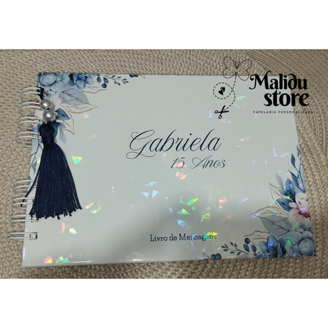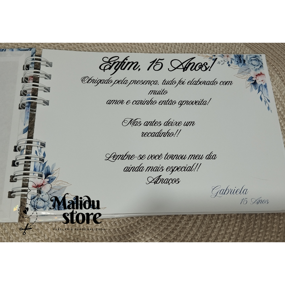 Livro de Mensagens Personalizado Tenha um livro exclusivo para o grande dia ✨ Pode ser usado para Aniversario, Casamento Chá de Bebe como desejar! ************************Leiam com Atenção... NÃO CRIAMOS ARTES, CASO DESEJE UMA ARTE QUE NÃO SEJA DA NOSSA LOJA, CRIE A SUA ARTE NO TAMANHO 21X15 cm EM PNG. NÃO NOS RESPONSABILIZAMOS POR ARTES MAL FEITAS, QUANDO VC FIZER A SUA ARTE APENAS FAZEMOS A IMPRESSÃO, ATENTE-SE A ISSO, A TONALIDADES E ERROS ORTOGRAFICOS Especificações: - Tamanho A5 - Encadernação wire-o (duplo anel). - Capa impressa em papel fotográfico de alta qualidade. - Laminação BOPP Brilho ou Holográfico na capa ( você escolhe na hora da finalização do pedido) - Medidas da capa 15,5cm x 21,5cm - 50 folhas ( Personalização apenas na parte da frente ) -100 folhas ( Personalização apenas na parte da frente ) E não esqueçam de mandar o nome imediatamente, pois nosso prazo é curto! ATENÇÃO ARTES COM CORES CHAPADAS (FORTES), NÃO FAZEMOS, NOS CONSULTE ANTES DE EFETUAR A COMPRA, CASO CONTRÁRIO SERA AUTOMATICAMENTE CANCELADO
