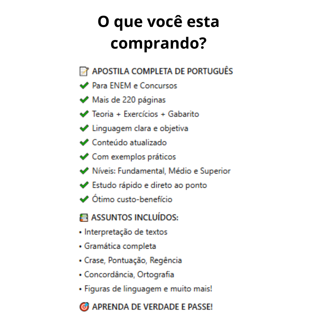 📝 APOSTILA COMPLETA DE PORTUGUÊS ✔️ Para ENEM e Concursos ✔️ Mais de 220 páginas ✔️ Teoria + Exercícios + Gabarito ✔️ Linguagem clara e objetiva ✔️ Conteúdo atualizado ✔️ Com exemplos práticos ✔️ Níveis: Fundamental, Médio e Superior ✔️ Estudo rápido e direto ao ponto ✔️ Ótimo custo-benefício 📚 ASSUNTOS INCLUÍDOS: • Interpretação de textos • Gramática completa • Crase, Pontuação, Regência • Concordância, Ortografia • Figuras de linguagem e muito mais! 🎯 APRENDA DE VERDADE E PASSE!