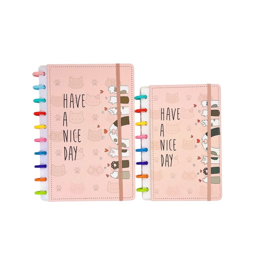 Caderno Inteligente de Gatinho Informações do produto; - Envio de modelos aleatorio; - Disponivel no tamanho B5; - Modelo com 10 discos B5; - Pode trocar as folhas; - Medida 25x19 B5 - Medida 14x21 A5 Envio Imediato